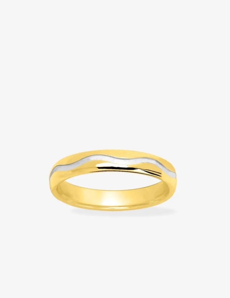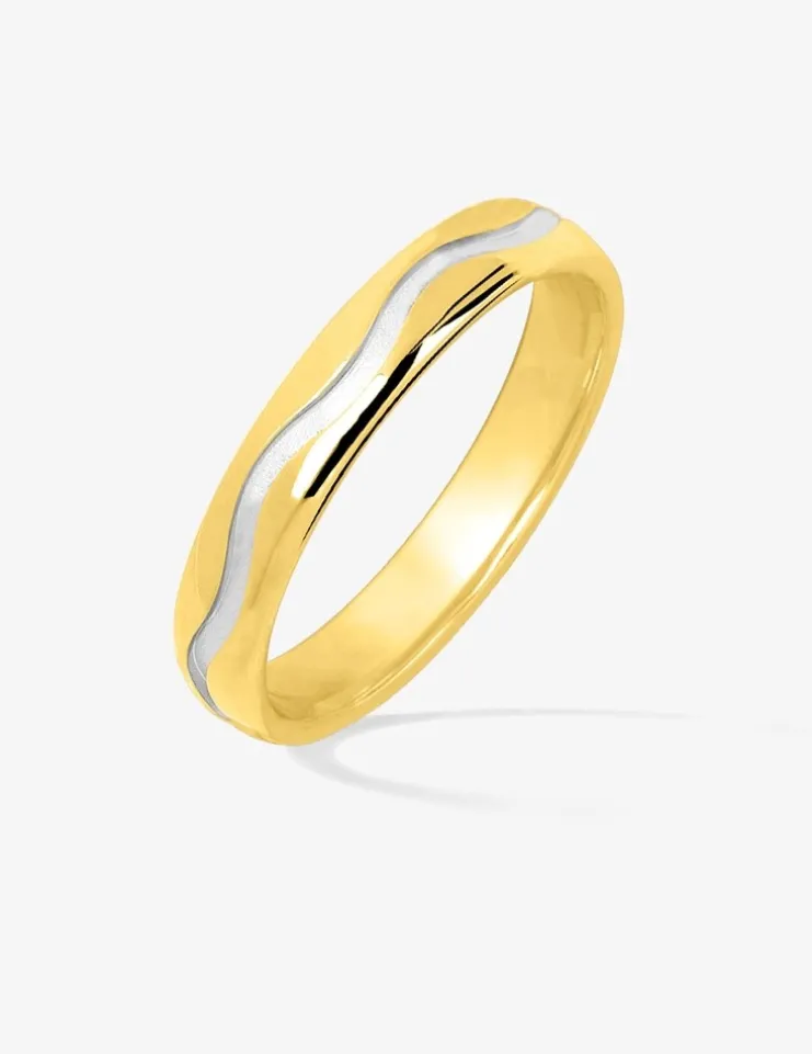 Alliance en or jaune et blanc 750 ‰ (18 carats). Cette alliance contemporaine est bicolore, or jaune rodhié. Son poids d’or moyen est de 3,10 g en taille 54.Cette alliance contemporaine mat et brillant au motif vague est simple et élégante.Cette alliance peut être gravée à l’intérieur du corps de bague.
