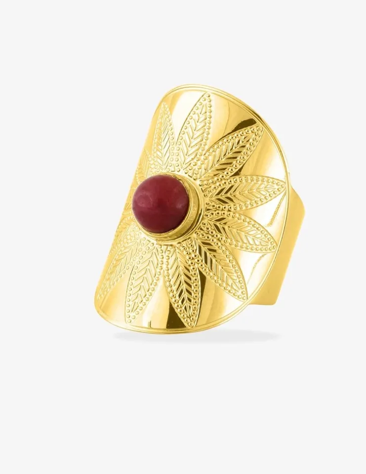 Bague en acier doré de la collection APA. Bague large avec motif feuilles et agate rouge au centre.Taille unique réglable. La collection acier APA s’adresse aux hommes et aux femmes. Ses bijoux en acier inoxydable ont un style original, fantaisie et coloré, vous pourrez pour certains les associer en parure. Vous trouverez forcément celui qui vous correspond dans le vaste choix de cette collection.