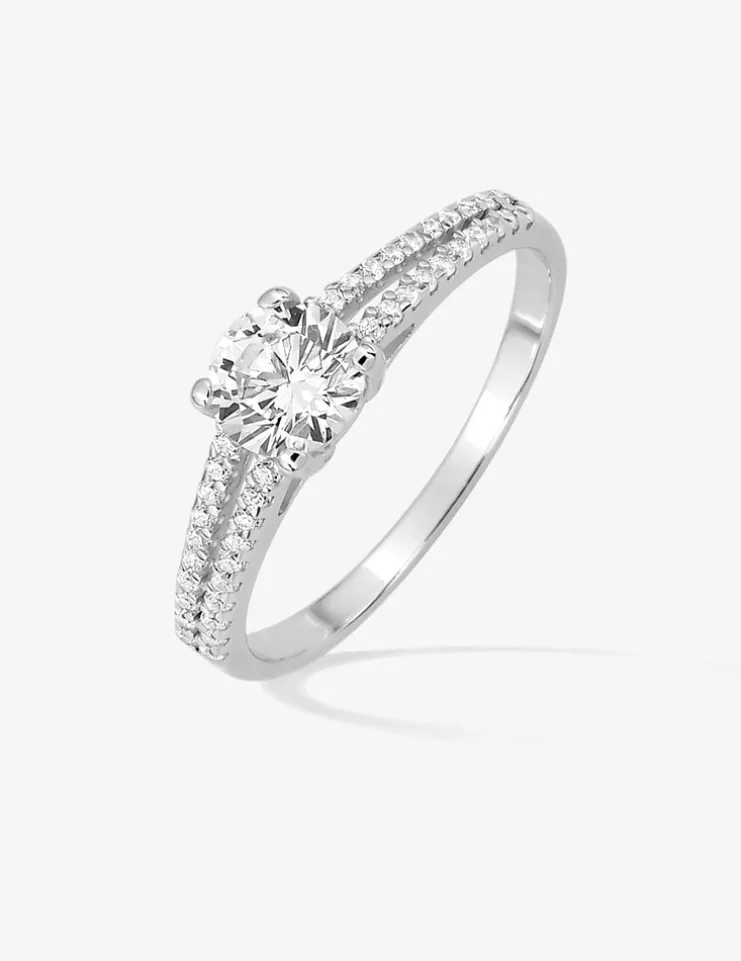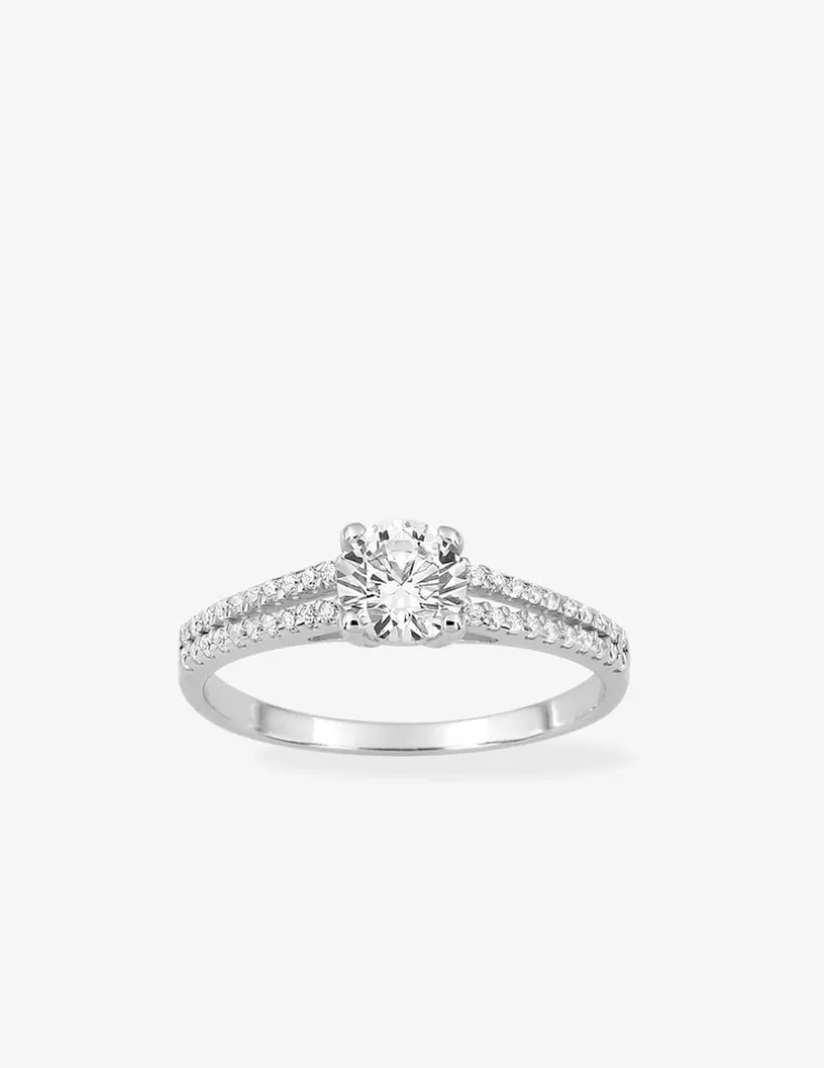 Cette éclatante bague en argent 925‰ rhodié est dotée d’un oxyde de zirconium de 6 mm de diamètre. Celui-ci est serti 4 griffes sur la double monture de ce solitaire, elle aussi sertie d’oxydes.