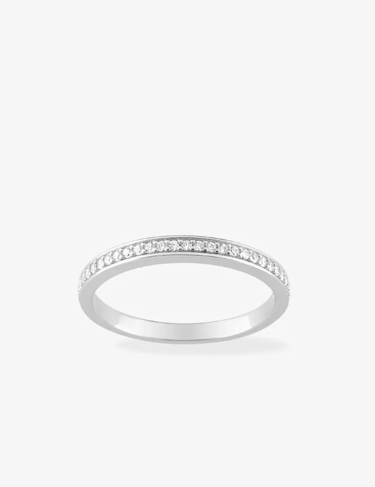 Cette bague classique et intemporelle faite en argent rhodié 925 ‰ est sertie d’oxydes de zirconium de 0,5 mm de diamètre. Elle a un poids de 1,50 g.