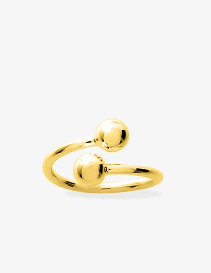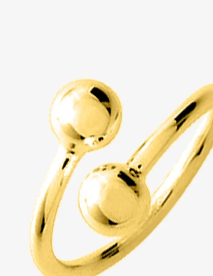 Cette bague en plaqué or dont la monture se croise sans se rejoindre laisse place à ses extrémités à des boules de 5 mm de diamètre pour offrir un design original.