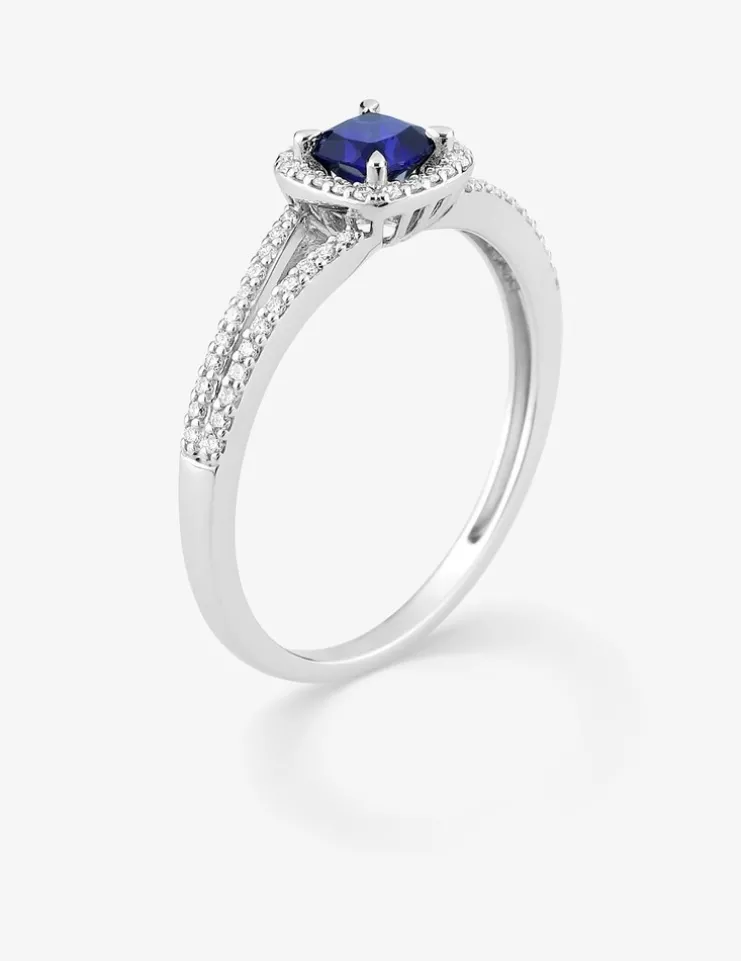 Bague en or blanc 375 ‰ (9 carats) mettant à l’honneur un magnifique saphir synthétique bleu de taille coussin mesurant 4 mm. Ce joyau central est magnifiquement mis en valeur par une couronne scintillante de diamants synthétiques de 0,20 carat, dont la brillance exceptionnelle crée une auréole de lumière qui semble danser autour du saphir. L’éclat de l’or blanc renforce ce contraste saisissant entre le bleu profond de la pierre principale et la pureté des diamants. Remarquablement légère avec un poids d’or moyen de 1,35 g seulement, cette bague offre un confort de port exceptionnel qui vous permettra de la porter du matin jusqu’au soir sans la moindre gêne. Sa silhouette parfaitement équilibrée allie présence visuelle et discrétion raffinée.