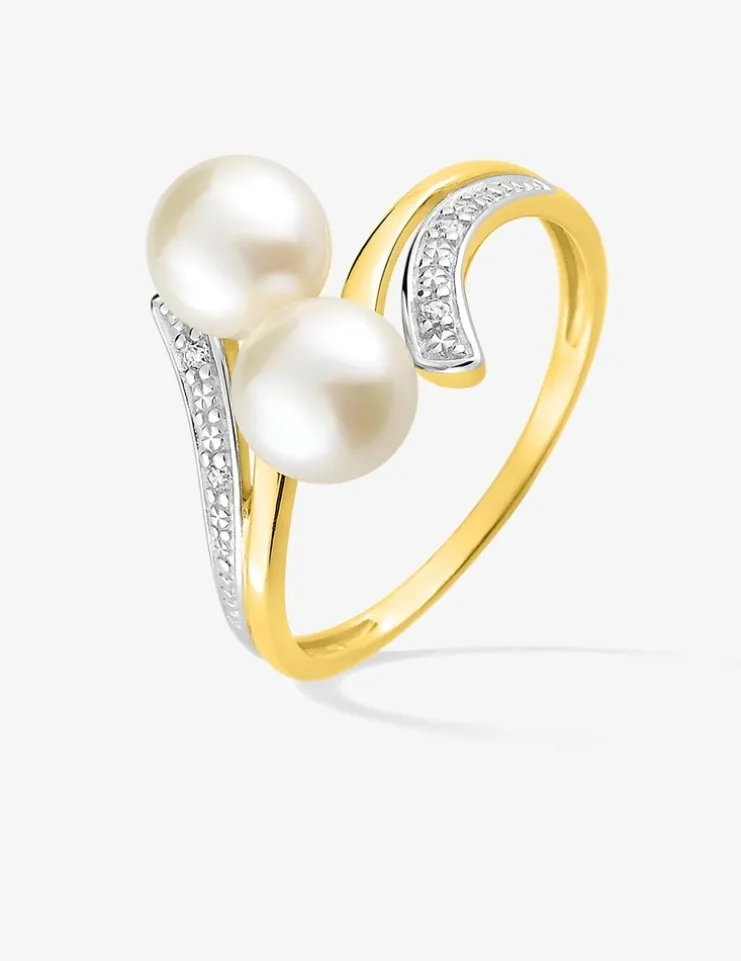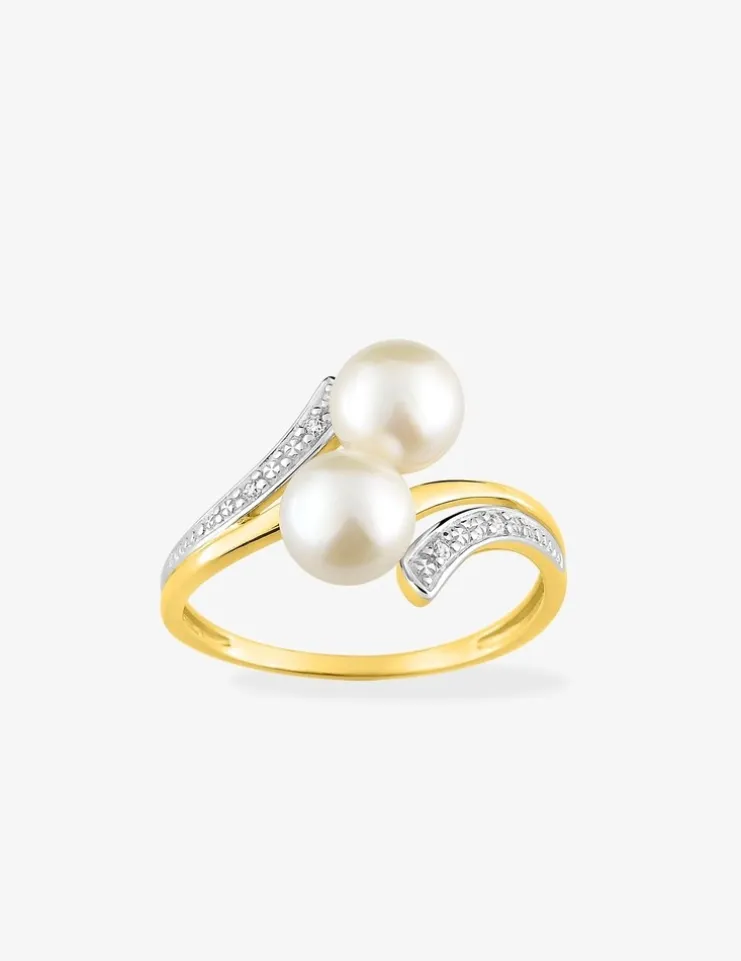 Cette bague à la monture fantaisie en plaqué or et en rhodium serti d’oxydes de zirconium accueille deux perles d’imitation de 6 mm de diamètre.