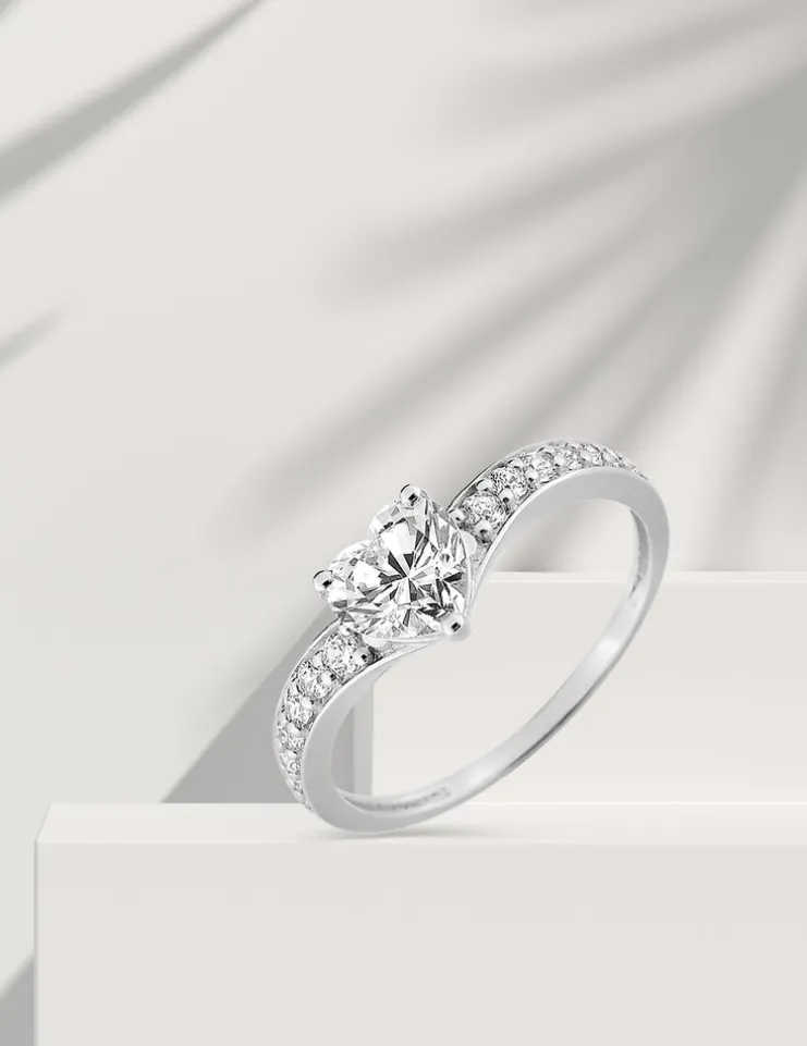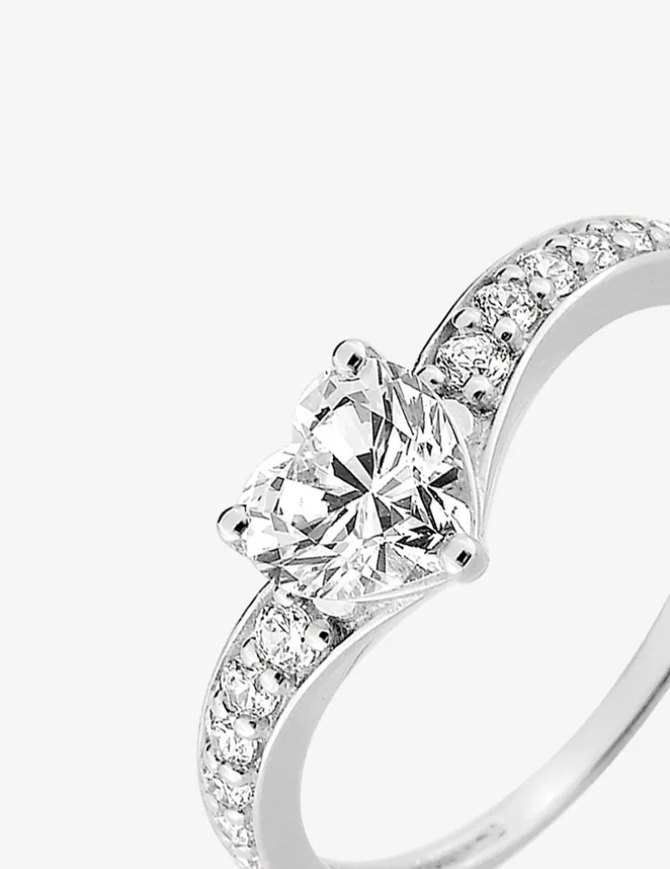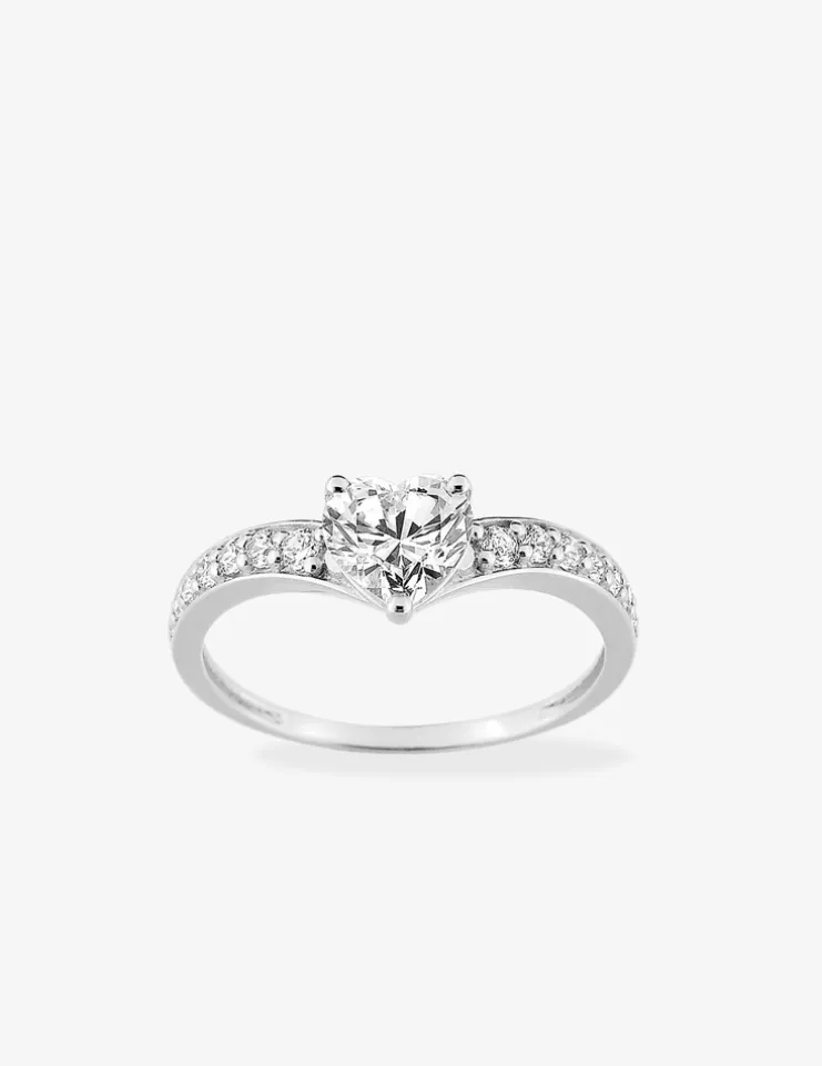Cette bague en or blanc 375 ‰ (9 carats) est composée d’un oxyde de zirconium en forme de cœur serti 4 griffes sur une monture aux motifs fantaisie sertie d’oxydes de zirconium.Le poids moyen d’or de ce solitaire est de 1,20 g en taille 54.