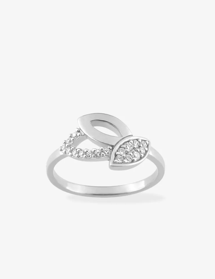 Cette bague au design original possède un motif de trois feuilles dont une est sertie d’oxydes de zirconium et l’autre en est pavée. Elle est faite en argent 925‰ rhodié.