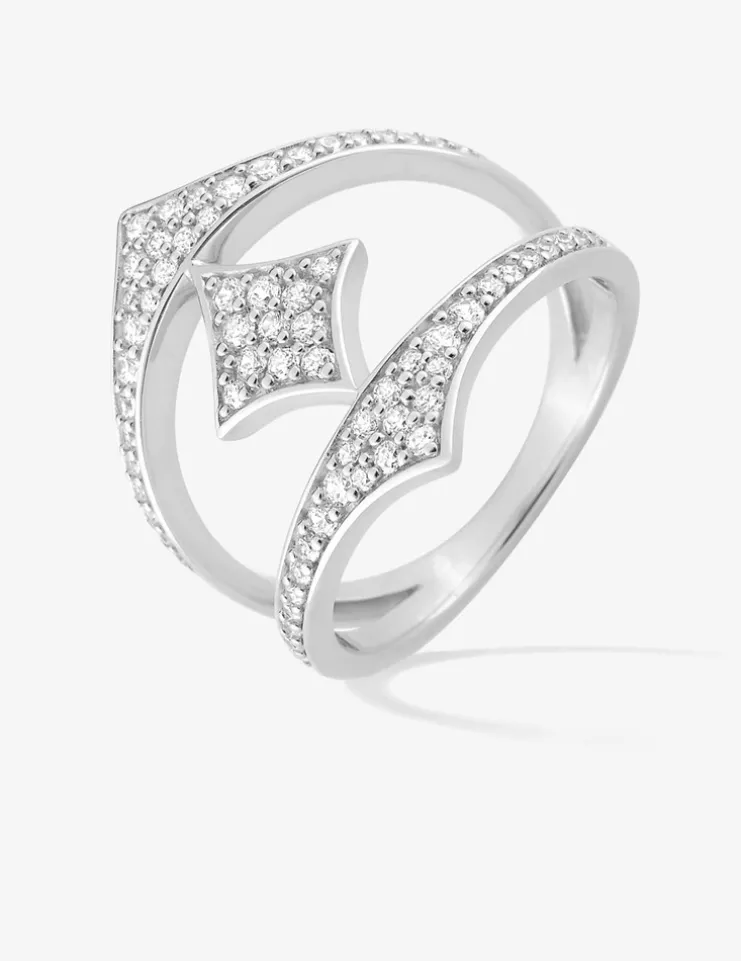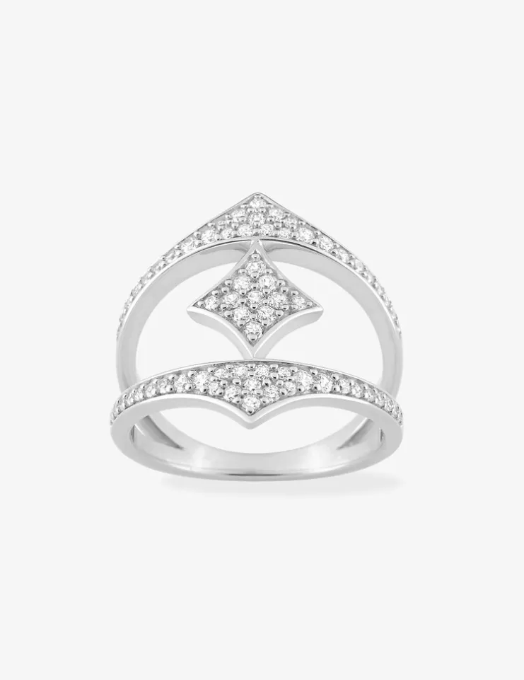 Cette bague en argent 925‰ rhodié possède des motifs triangulaires aux extrémités et un motif losange au centre pavés d’oxydes de zirconium. Elle mesure 16 mm de hauteur. Cette bague éclatante habillera votre doigt à la perfection.