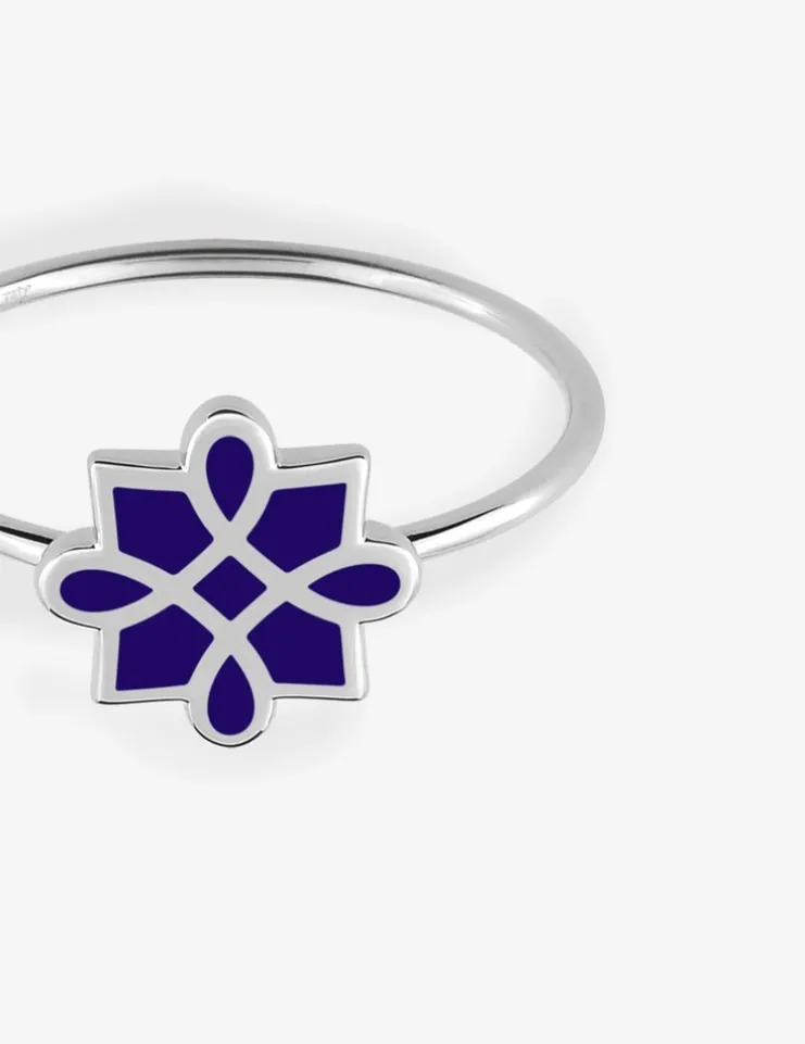 Bague » Lore » en or blanc 375‰ et laque de couleur bleue de la collection Harmonie. Ligne de bijoux porte-bonheur, déclinés en trois or, sa forme reprend le motif Infini stylisé.Le poids d’or moyen de cette bague en taille 54 est de 0,70 g.À porter sans modération !
