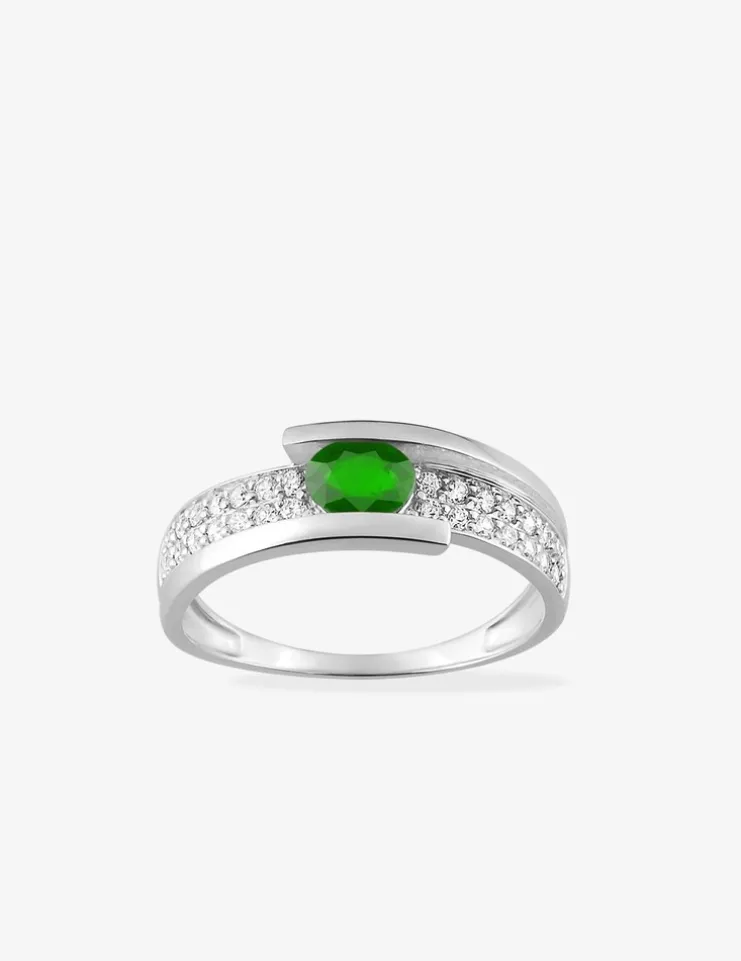 Superbe Bague or blanc 375‰ (9 carats) accompagnée d’une émeraude de forme ovale et d’oxydes de zirconium. Les oxydes de zirconium sont surmontés d’une émeraude bordée d’or blanc.Cette bague d’un poids d’or moyen de 1,90 g pour un diamètre de 54 mm est également disponible avec un saphir ou un rubis.Design sophistiqué à l’effet joaillerie pour cette sublime Bague or blanc accompagné de pierres précieuses. Son style et son éclat en font un bijou contemporain.