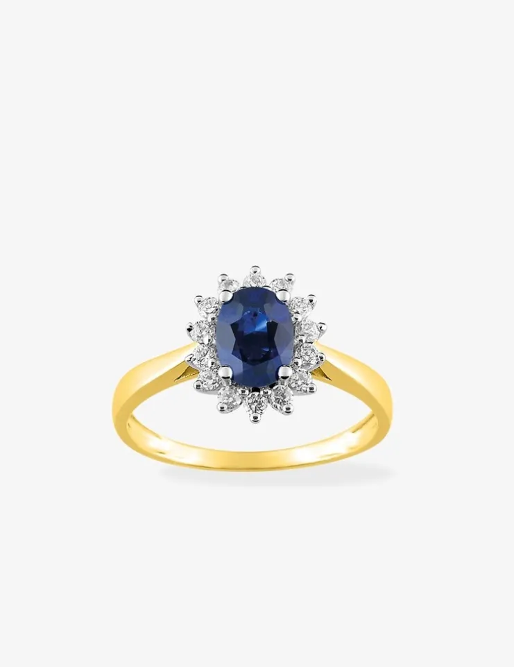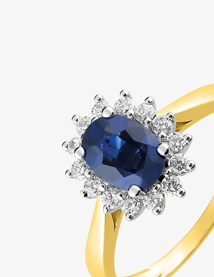 Bague en or jaune 750 ‰ (18 carats), rhodium, saphir et oxydes de zirconium. Un saphir ovale est entouré par des oxydes de zirconium sur une finition rhodium. La monture est en or jaune, le poids d’or moyen est de 1,80 g pour une taille 54.