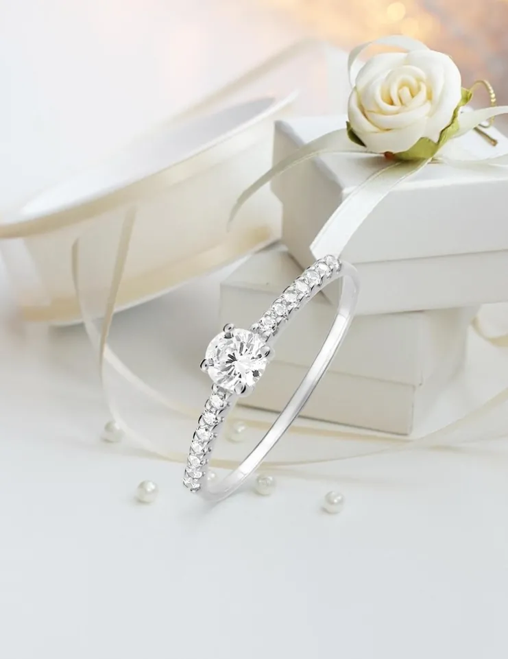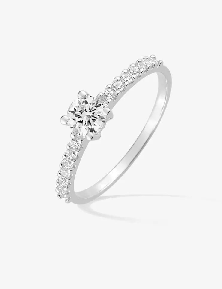 Cette bague en or blanc 375 ‰ (9 carats) est composée d’un oxyde de zirconium serti 4 griffes au centre de la monture avec une série d’oxydes de zirconium sertis de chaque côté.Le poids moyen d’or de ce solitaire est de 0,80 g en taille 54.