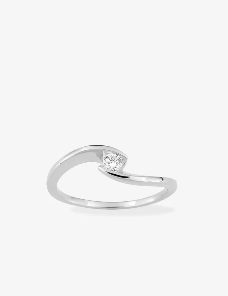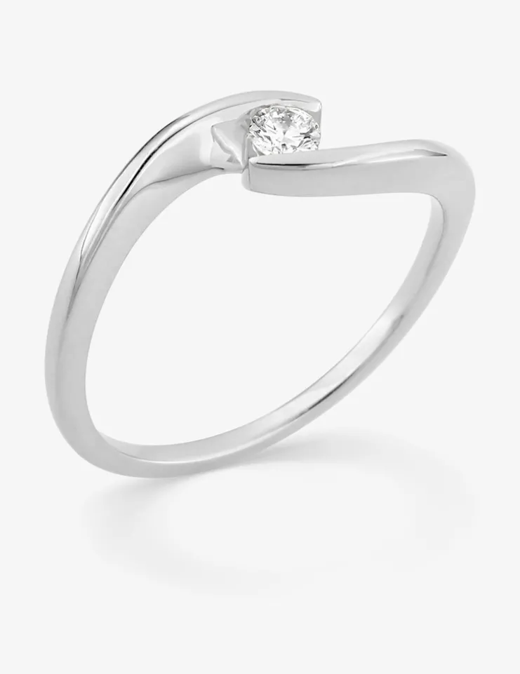Bague solitaire en or 375 ‰ (9 carats) blanc ornée d’un diamant synthétique de 0,10 ct tenu dans un serti illusion. Cette bague classique et élégante affiche un poids d’or moyen de 1,30 g. pour la taille 54 et rehaussera vos tenues avec une touche de brillance subtile.