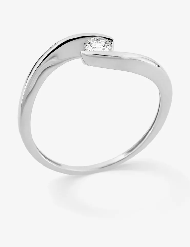 Bague solitaire en or 375 ‰ (9 carats) blanc ornée d’un diamant synthétique de 0,15 ct tenu dans un serti illusion. Cette bague classique et élégante affiche un poids d’or moyen de 1,30 g. pour la taille 54 et rehaussera vos tenues avec une touche de brillance subtile.
