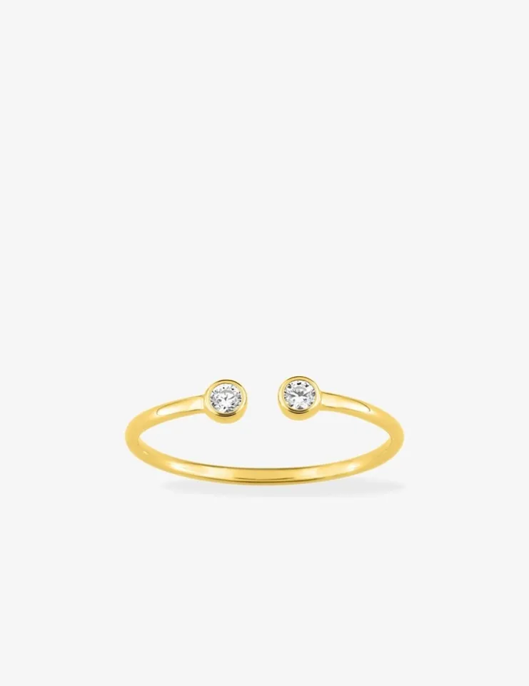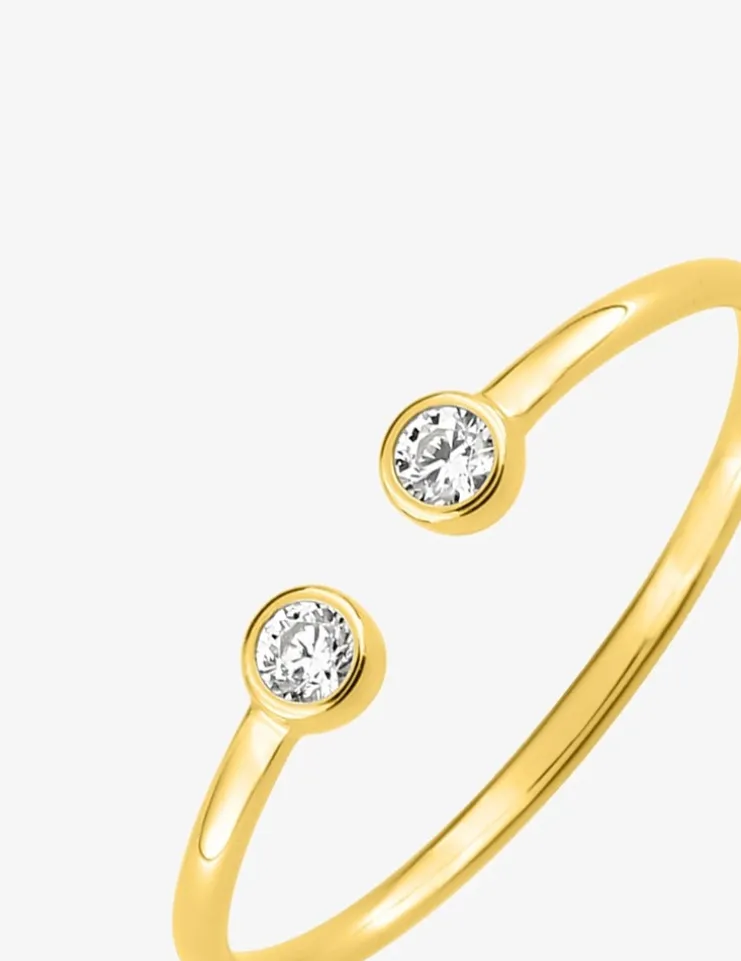 Bague toi et moi en or jaune 750 ‰ (18 carats) et oxyde de zirconium. Cette bague à la monture or jaune a une finition lisse, elle est ouverte sur le dessus avec ses deux oxydes de zirconium en serti clos. Le poids théorique en or est de 0,90 g.