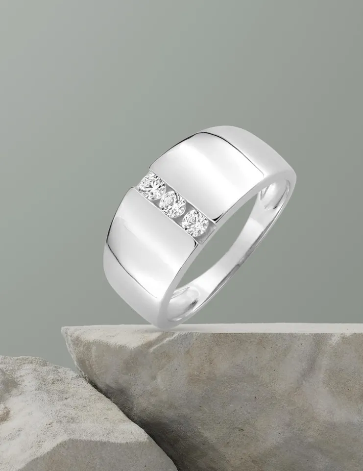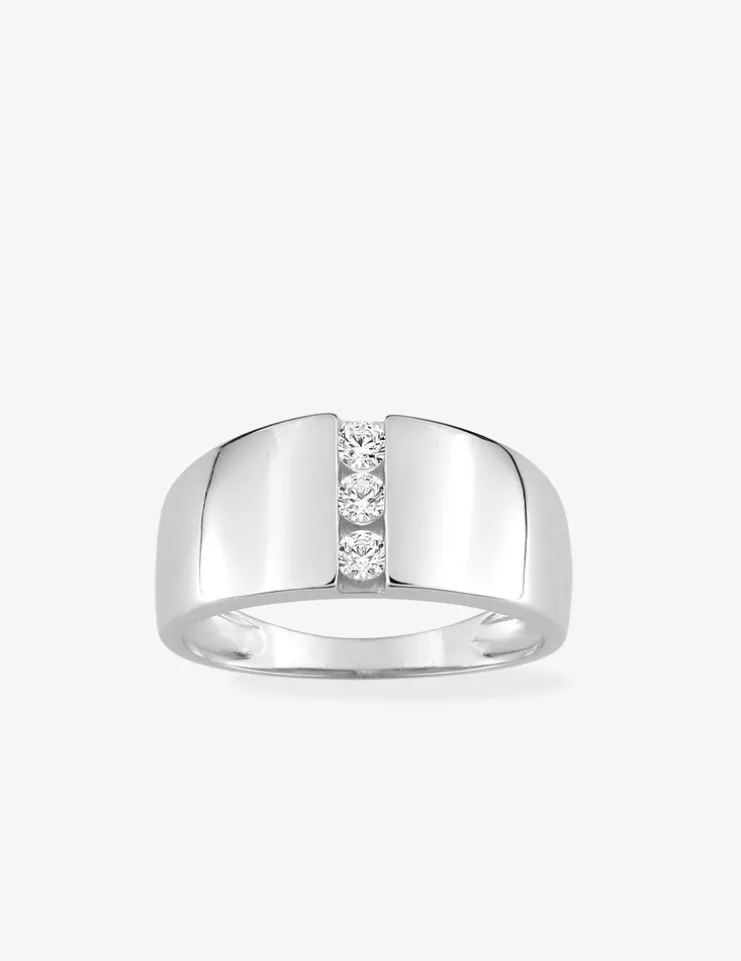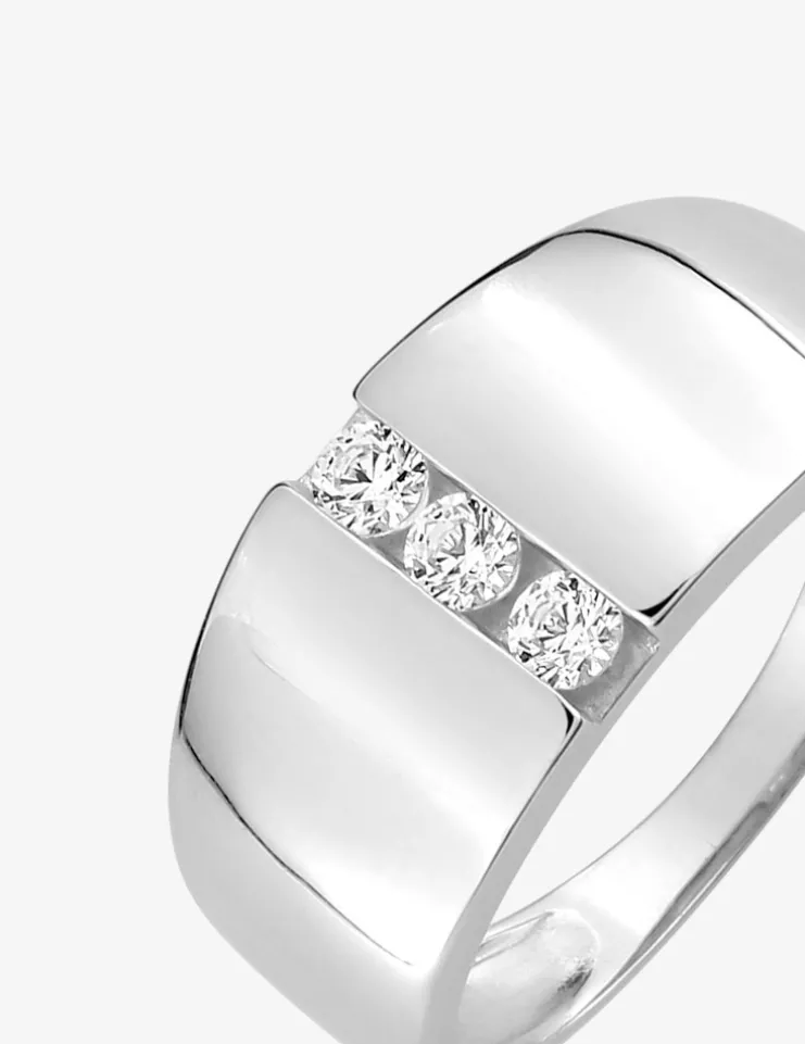 Cette bague en or blanc 375 ‰ (9 carats) possède 3 oxydes de zirconium pris dans une large monture.Le poids moyen d’or de cette trilogie est de 3,00 g en taille 54.