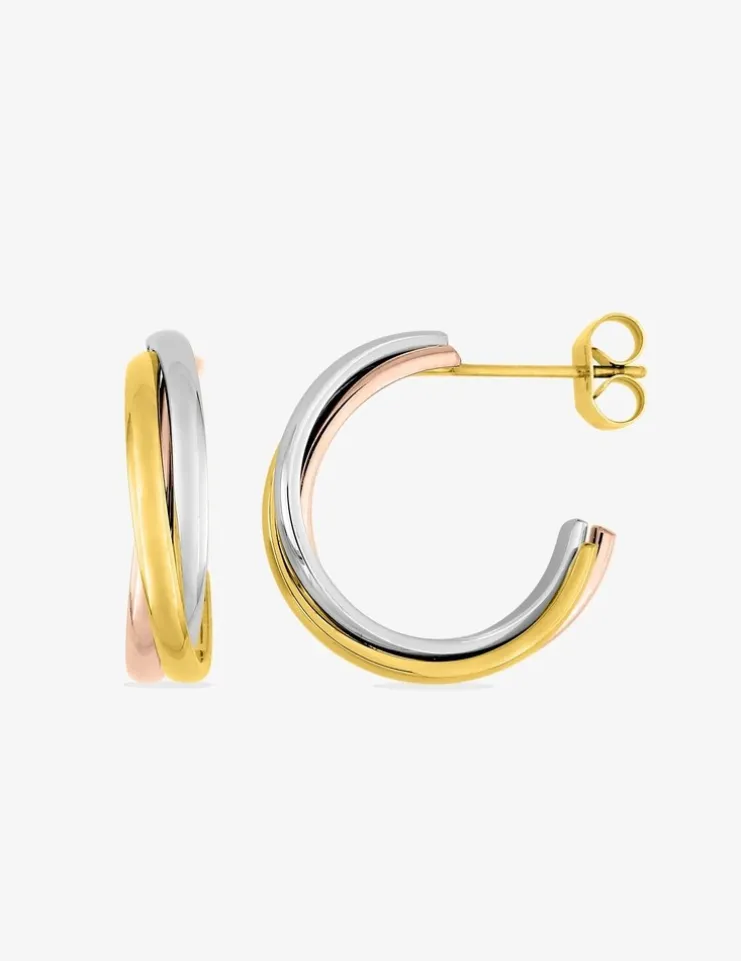 Boucles d’oreilles créoles en acier jaune, gris et rose. Ces boucles d’oreilles tricolores ajouteront une touche unique et colorée à vos tenues. Le fermoir poussette assure la sécurité tout au long.de la journée. Avec leur poids de 4,30 g.ainsi que leur diamètre de 20 mm, ces boucles d’oreilles sont confortables et idéales pour compléter votre look quotidien.