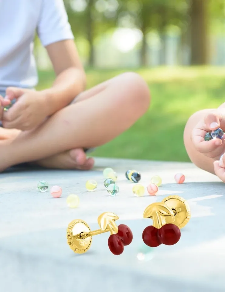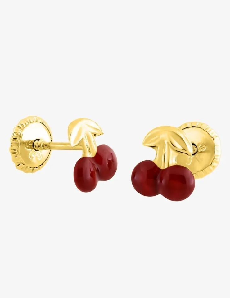 Boucles d’oreilles clous en or jaune 750 ‰ (18 carats). Clous d’oreilles enfants, motif cerise et laque rouge. Le poids théorique d’or est de 0,35 g, elles sont équipées d’un fermoir poussette vis.