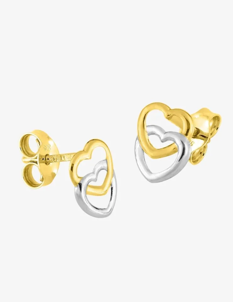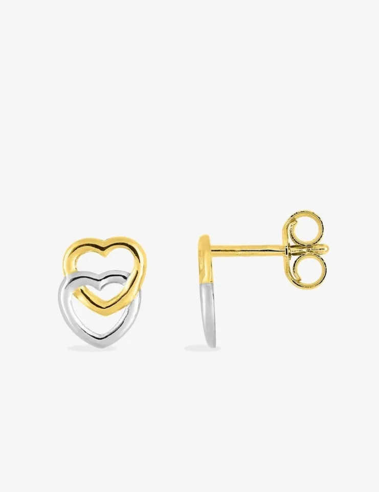 Boucles d’oreilles clous or jaune 750 ‰ (18 carats) et rhodium. Deux jolis cœurs entrelacés or jaune et rhodium pour ces clous d’oreilles avec un fermoir poussette belge et un poids d’or théorique de 0,40 g.