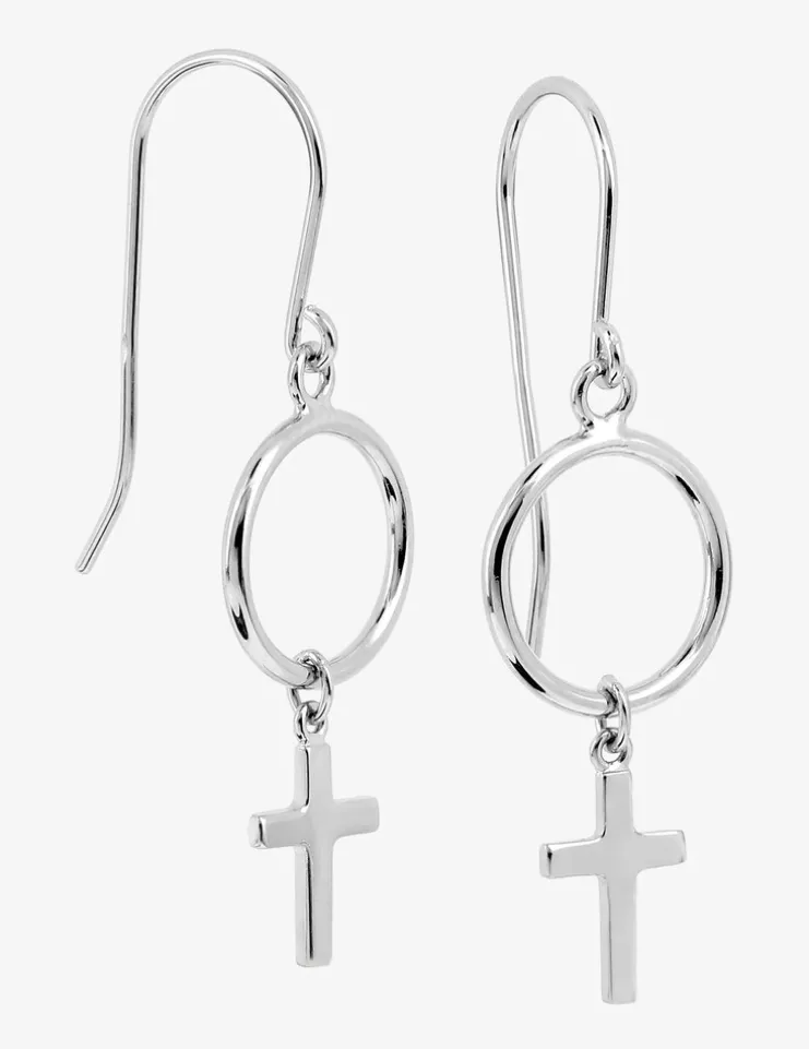 Ces boucles d’oreilles en argent 925‰ rhodié possèdent un cercle de 10 mm de diamètre auquel est accrochée une croix de 9 mm par 6 mm. Leur fermoir crochet en font un bijou facile à enfiler.