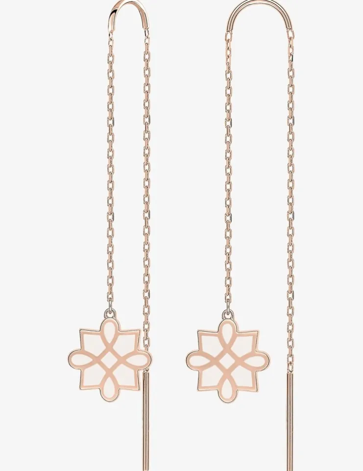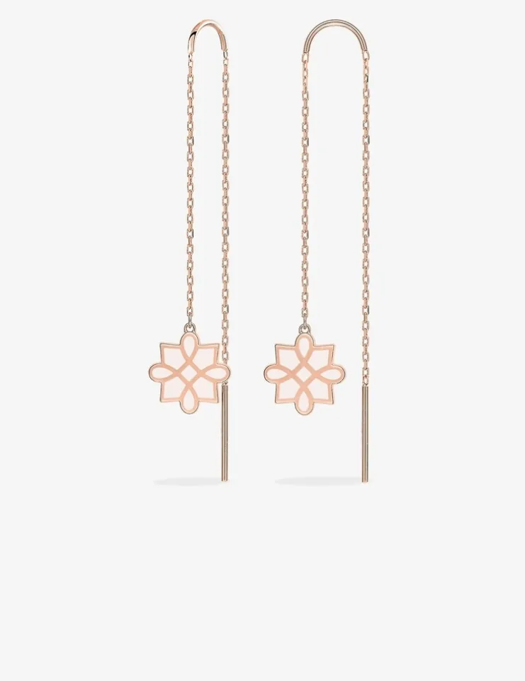 Boucles d’oreilles » Lore » en or rose 375‰ et laque de couleur ivoire de la collection Harmonie. Ligne de bijoux porte-bonheur aux couleurs douces ou acidulées, déclinés en trois ors, ornés de laque. Sa forme reprend le motif Infini en parfaite symétrie. Ces boucles d’oreilles pendantes sont synonymes de féminité et de sensualité.Le poids d’or moyen de ces boucles d’oreilles est de 0,85 g. À porter sans modération !