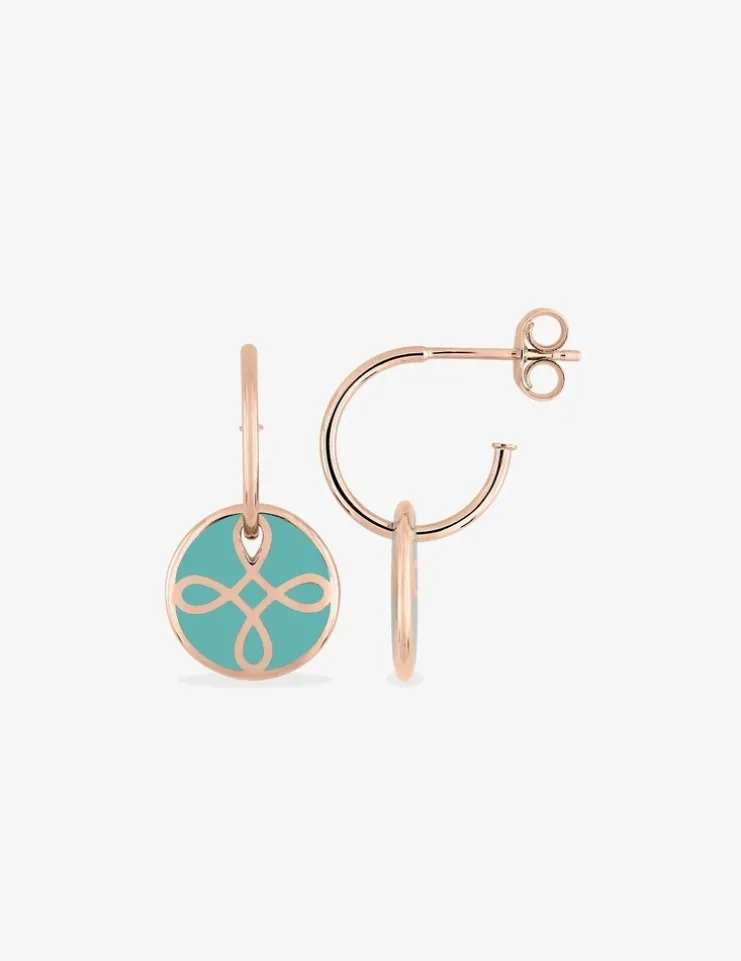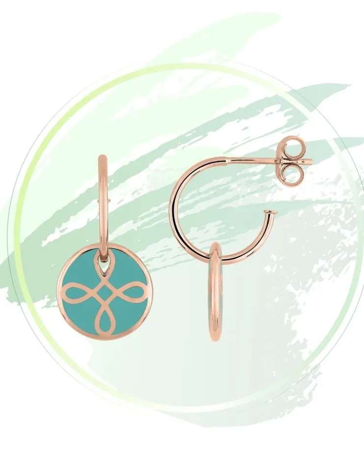 Boucles d’oreilles » Lore » en or rose 375‰ et laque de couleur verte aqua de la collection Lorever. Boucles d’oreilles fines ornées d’un motif jeton simple et délicat, qui évoque le symbole de l’infini, de l’amour éternel.Le poids d’or moyen de ces boucles d’oreilles est de 1,20 g.