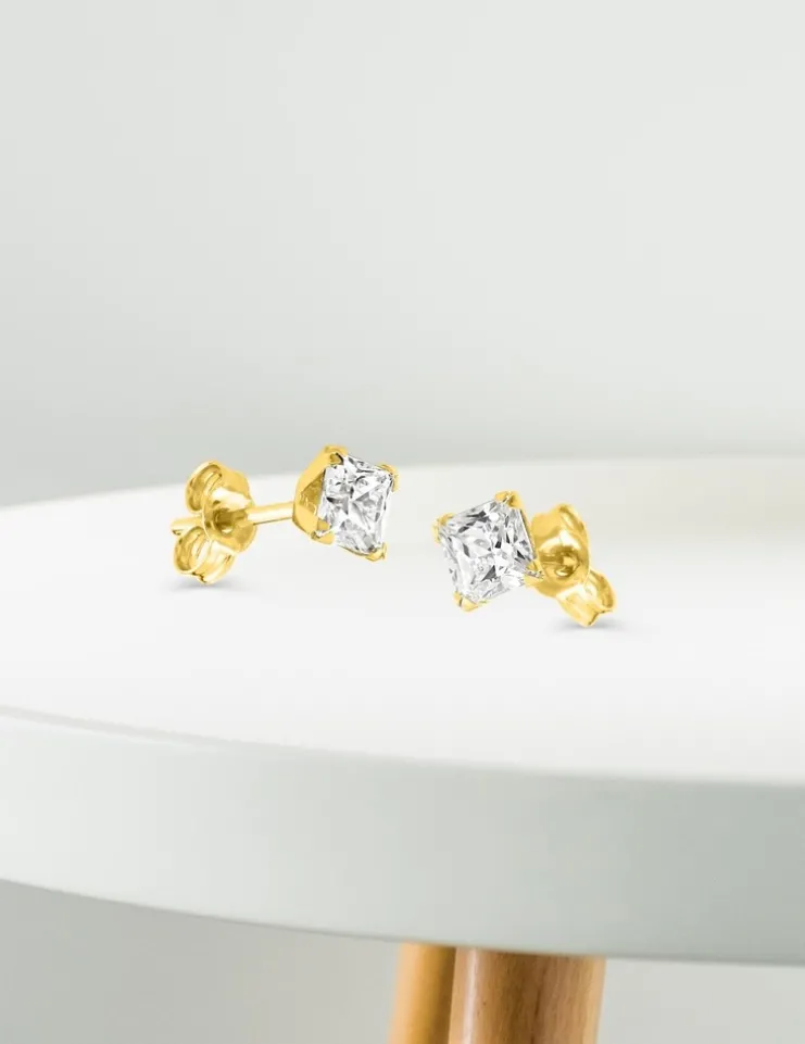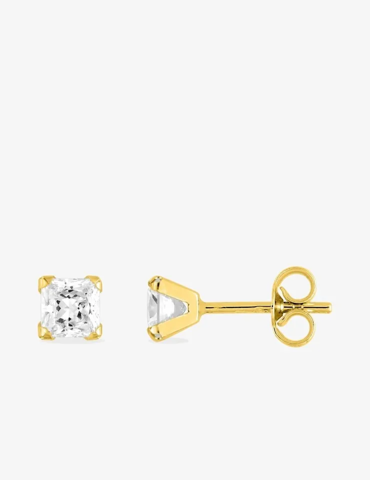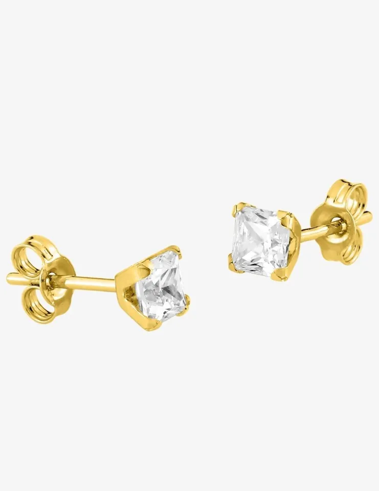 Boucles d’oreilles clous or jaune 750 ‰ (18 carats). Boucles d’oreilles avec oxyde de zirconium 4×4 mm carré sertis griffes. Poids or théorique 0,40 g, fermoir poussette belge.