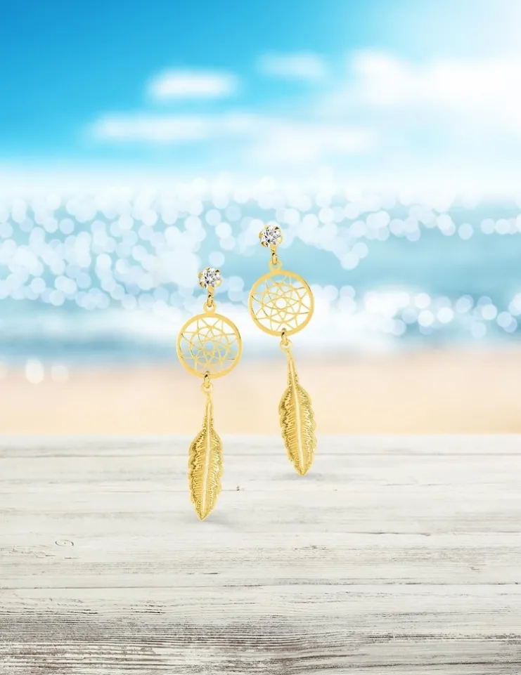 Boucles d’oreilles en or jaune 375‰ (9 carats) pendantes attrape-rêve serties d’un oxyde de zirconium. Elles se composent d’une rosace découpée à laquelle est fixée une plume. Ces boucles d’oreilles ont un poids moyen d’or de 0,65 g et sont dotées d’un système de fermeture avec des poussettes belges.Un joli cadeau pour un anniversaire ou une autre occasion.