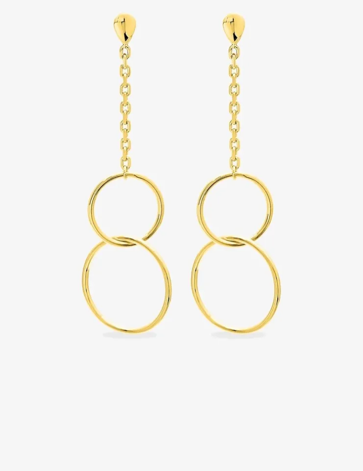 Ces boucles d’oreilles possèdent deux anneaux (un de 10 mm et un de 15 mm) au bout d’une chaîne forçat. Elles sont en plaqué or et ont un système de fermoir poussette.