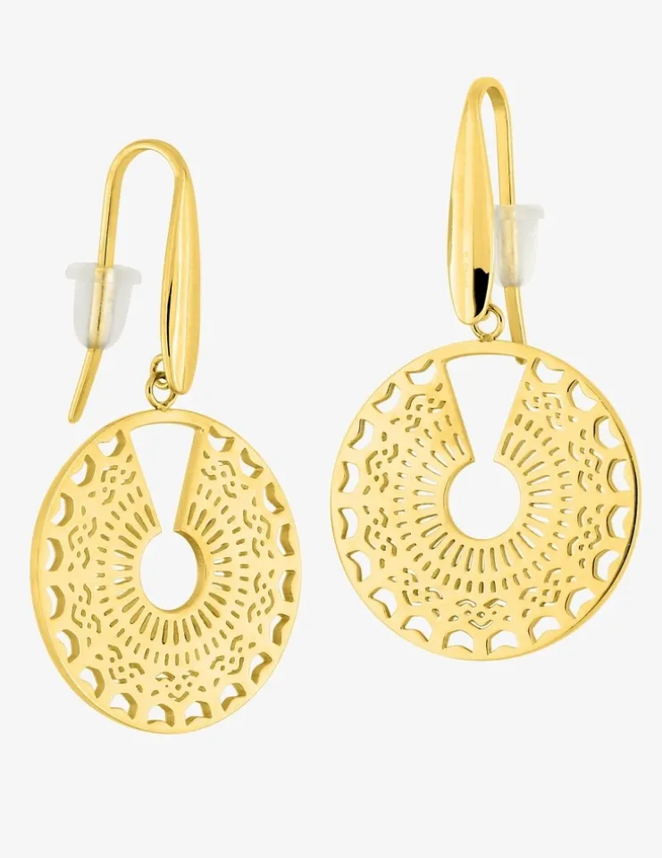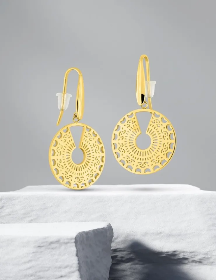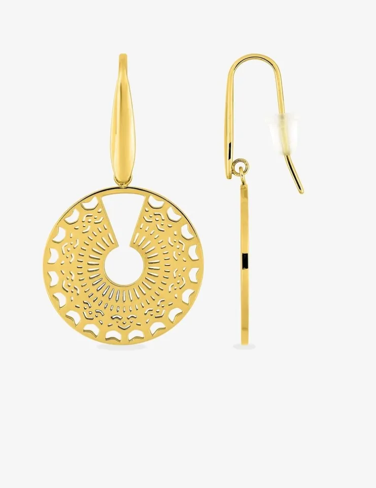 Boucles d’oreilles en acier doré de la collection APA. Ces boucles d’oreilles de formes rondes pendantes ont un joli motif fantaisie ajouré. Fermoir crochet avec poussette en silicone.La collection acier APA s’adresse aux hommes et aux femmes. Ses bijoux en acier inoxydable ont un style original, fantaisie et coloré, vous pourrez pour certains les associer en parure. Vous trouverez forcément celui qui vous correspond dans le vaste choix de cette collection.