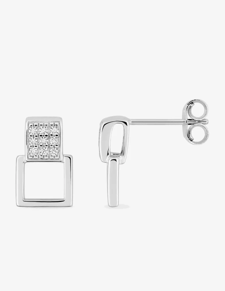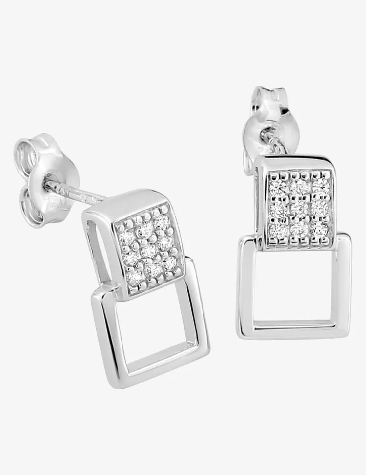 Boucles d’oreilles pendantes or blanc 750 ‰ (18 carats). Une jolie paire de boucles d’oreilles pendantes à la forme carrée et sertis d’oxydes de zirconium en pavage sur la partie haute. Le fermoir est de type poussette belge et le poids théorique d’or de 1,75 g.