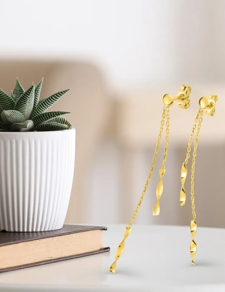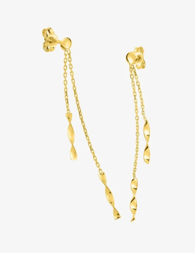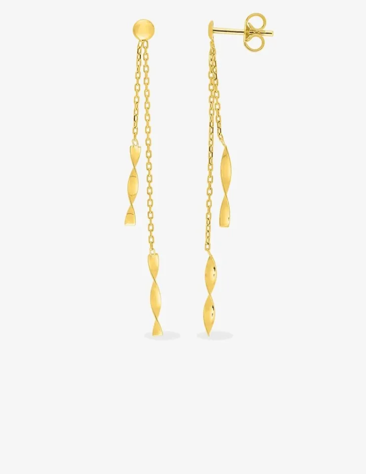 Boucles d’oreilles pendantes or jaune 375‰ (9 carats) composées de deux fines chaines, au bout desquelles est suspendu un motif rectangle vrillé. Ces boucles d’oreilles ont un poids moyen d’or de 0,60 g et un système de fermeture avec « poussettes belges ».Des boucles d’oreilles aériennes et tendance.