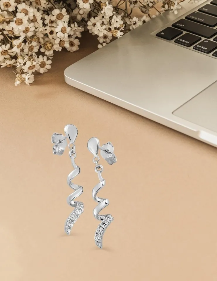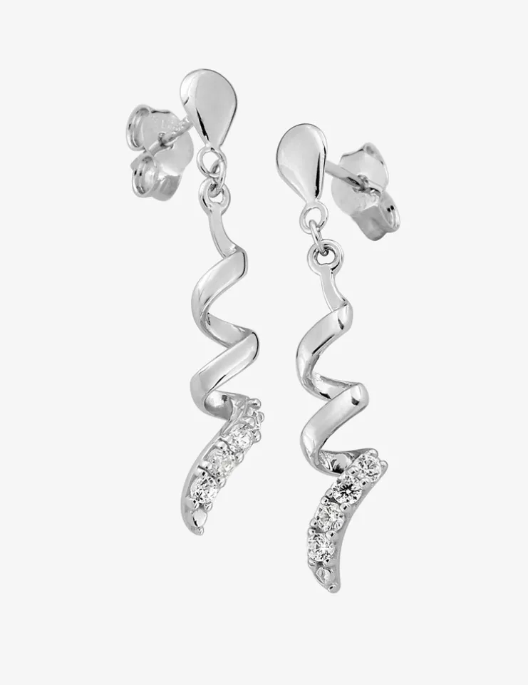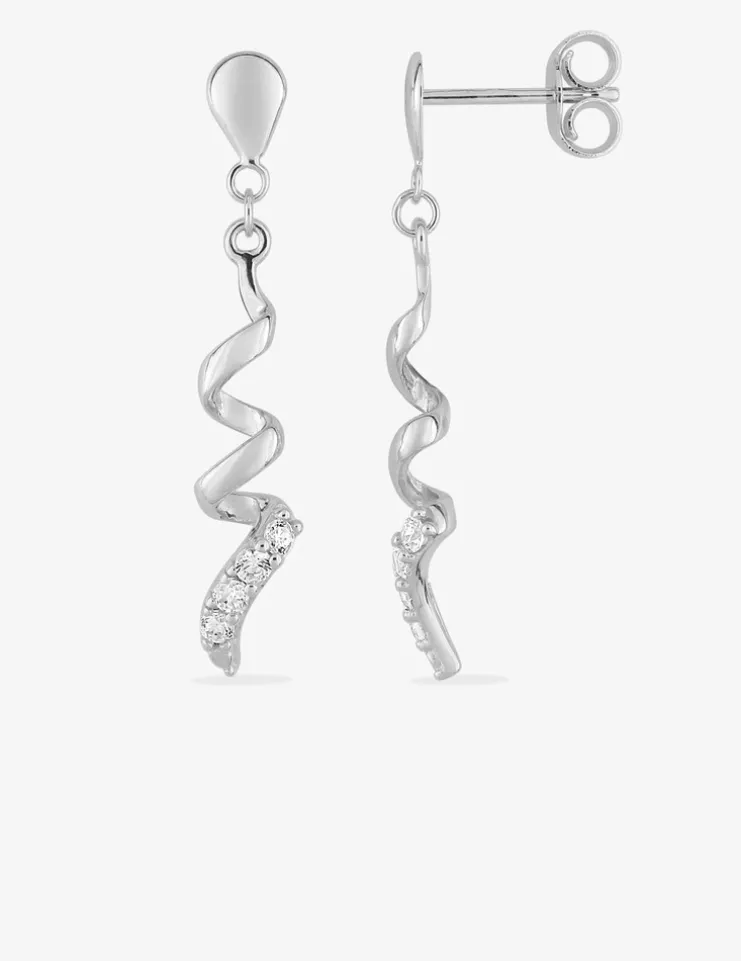 Boucles d’oreilles en or blanc 375‰ (9 carats) pendantes qui se composent d’un ruban en or qui est en forme de spirale avec des oxydes de zirconium déposés sur l’extrémité du ruban.