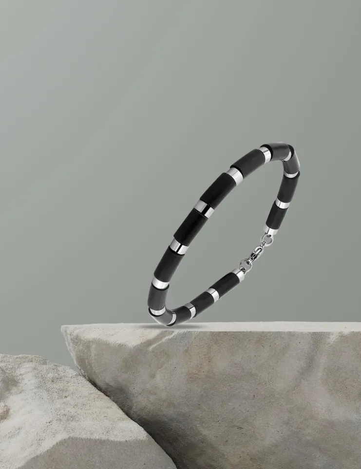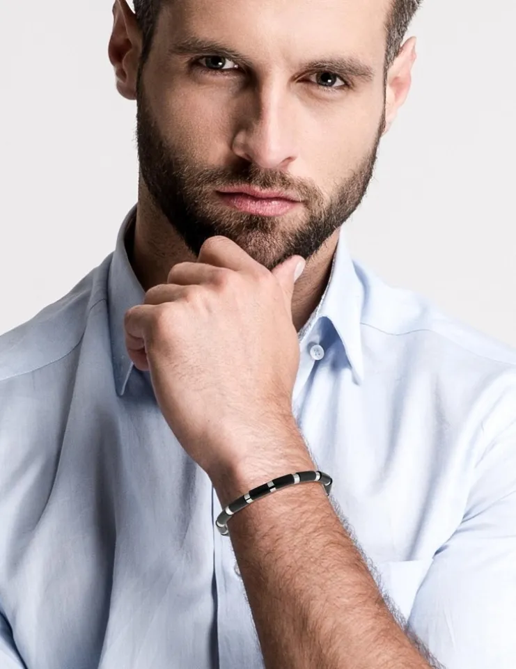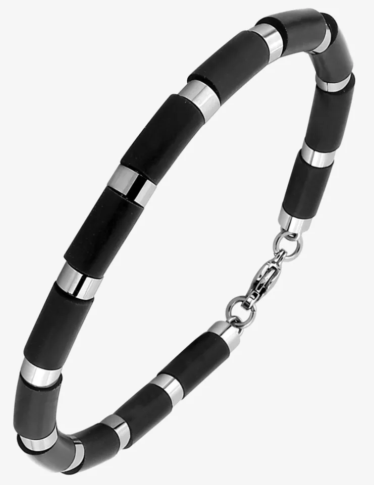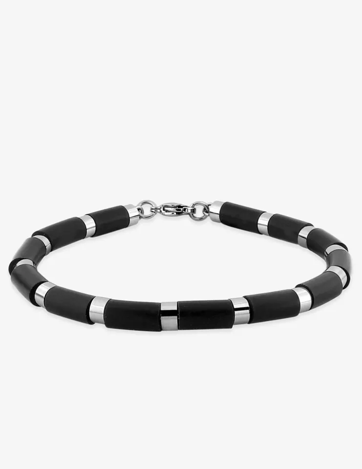 Bracelet en acier inoxydable de la collection CARGO.Ce bracelet est composé de motifs acier alternés par des motifs caoutchouc noir. Ce bracelet dispose d’une longueur ajustable de 19 à 22 cm, avec un fermoir mousqueton.La collection CARGO s’adresse plus particulièrement aux hommes. Ses bijoux en acier inoxydable ont un style affirmé et intemporel. Ils s’accommoderont avec chaque style, ce qui en fait un cadeau idéal.