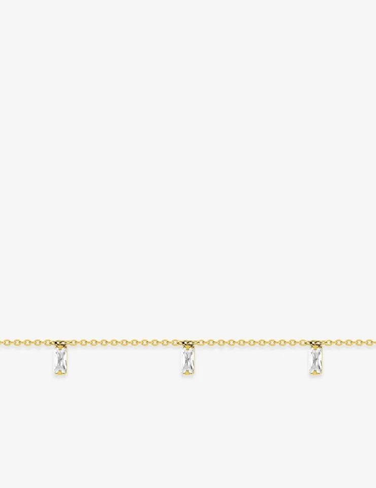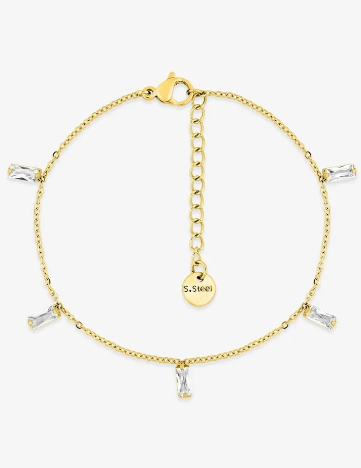 Ce bracelet en acier doré est sublimé d’oxydes de zirconium blancs taillés en rectangle de 5 mm par 2 mm. Il mesure 16 cm plus 3 cm de chaîne de rappel et le fermoir est de type mousqueton.