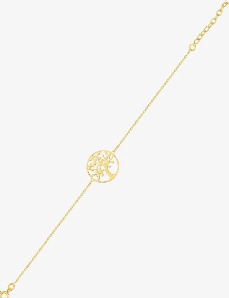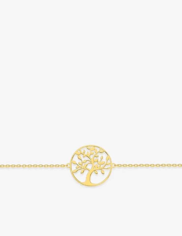Ce bracelet en plaqué or est composé d’une chaîne forçat de 16 cm plus 3 cm de chaîne de rappel et d’un motif d’arbre de vie de 15 mm de diamètre. Son fermoir est un anneau ressort.
