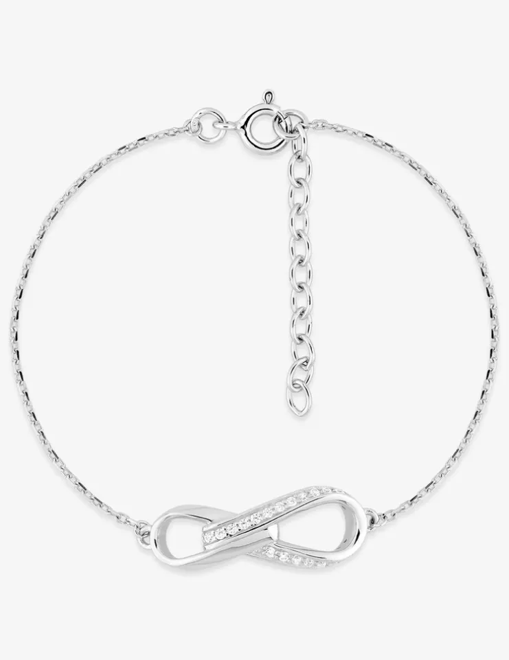 Optez pour ce bracelet en argent 925‰ rhodié. Il est doté d’un motif de deux boucles qui s’entremêlent, dont une qui est sertie d’oxydes de zirconium. Le bracelet mesure 16 cm plus 3 cm de chaîne de rappel et se ferme avec un anneau ressort.