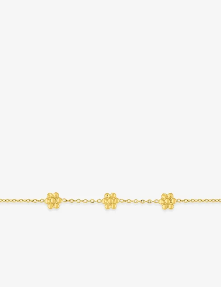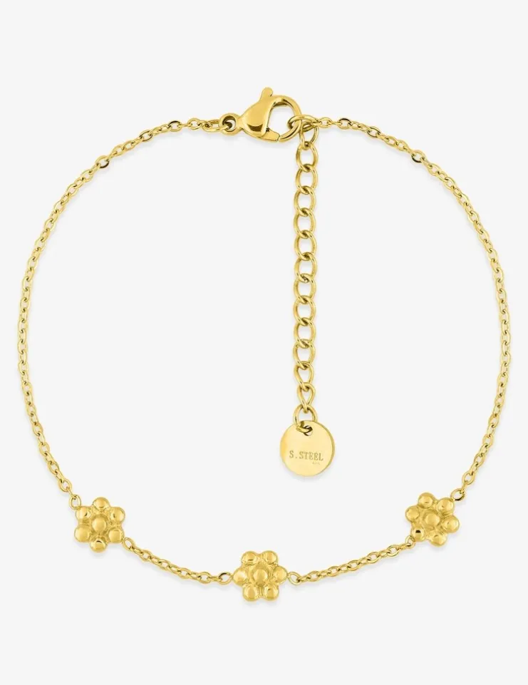 Bracelet acier doré souple tendance avec motif fleurs, longueur de 16 cm ajustable jusqu’à 19 cm qui correpond à un poids de 1,75 g , pampilles en forme de fleurs qui mesure chaqunes 6 mm.