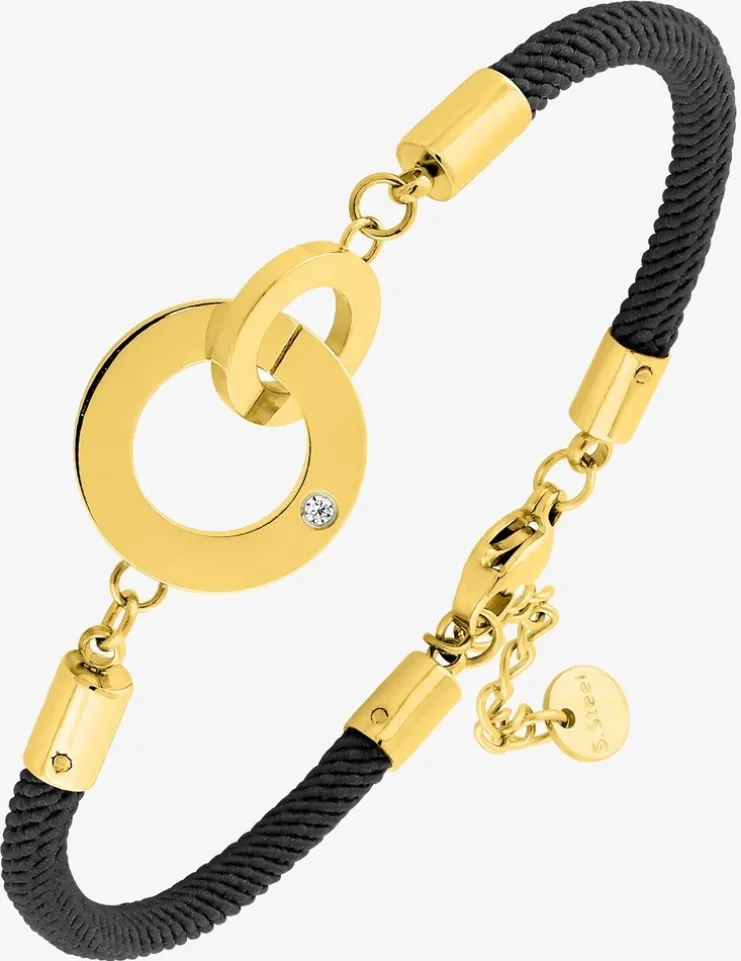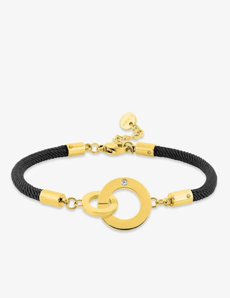 Ce bracelet au cordon en nylon noir se distingue par ses deux motifs circulaires entrelacés en acier doré, dont l’un qui est délicatement orné d’un oxyde de zirconium blanc. Sa longueur ajustable de 16 cm, complétée par une rallonge pratique de 3 cm, s’adapte parfaitement à votre poignet, tandis que son poids léger de 4,56 g assure un confort optimal pour un port quotidien. Le fermoir mousqueton offre une attache sécurisée et facile à manipuler. Un accessoire à la fois minimaliste et raffiné qui ajoutera une touche d’élégance discrète à toutes vos tenues.