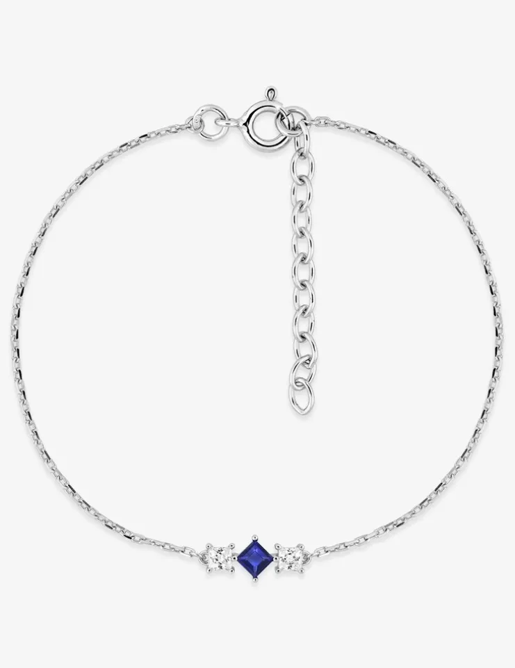 Bracelet en argent gris rhodié 925‰ de type trilogie, orné de trois pierres centrales serties griffes : un losange en oxyde bleu encadré de deux oxydes blancs carrés. Ajustable de 16 à 19 cm grâce à une chainette, ce bijou léger de 1,39 g allie confort et élégance, parfait pour sublimer toutes vos tenues.