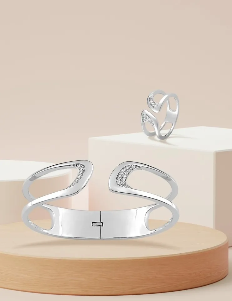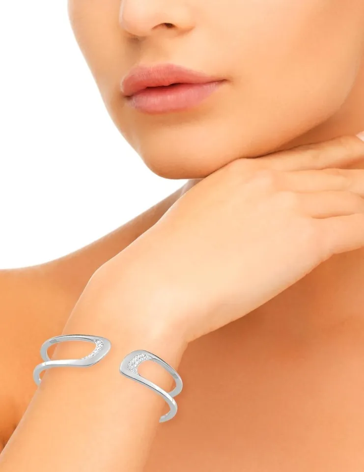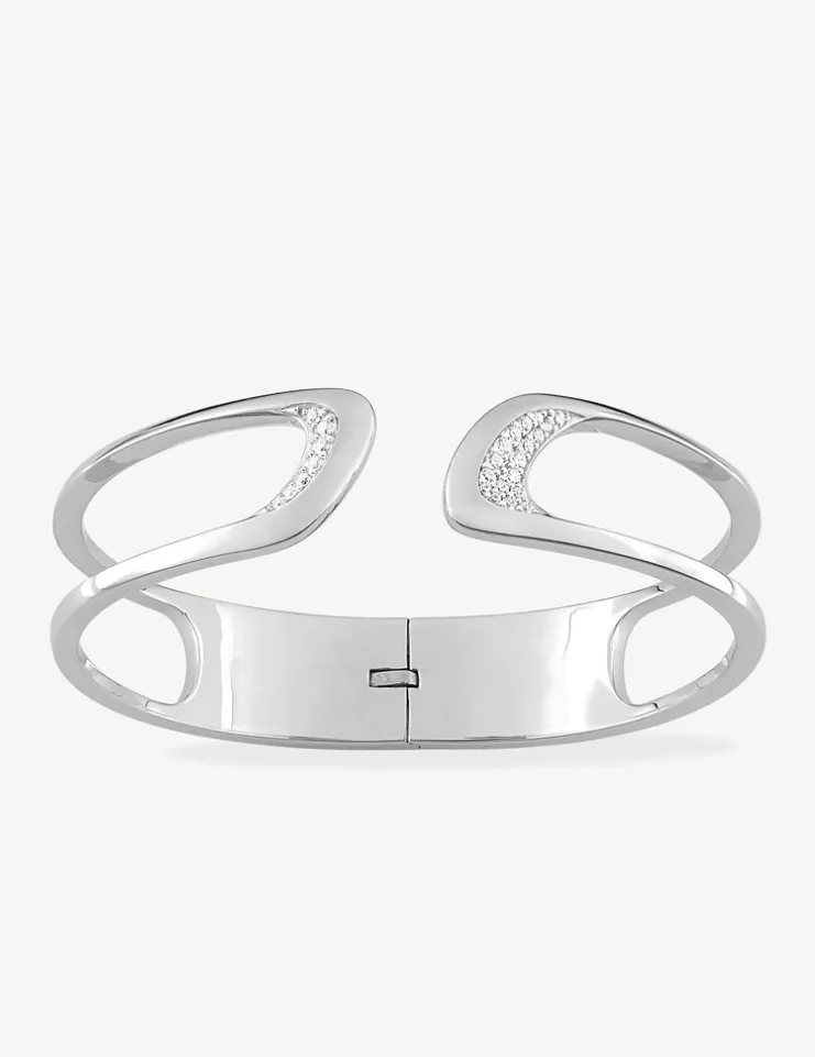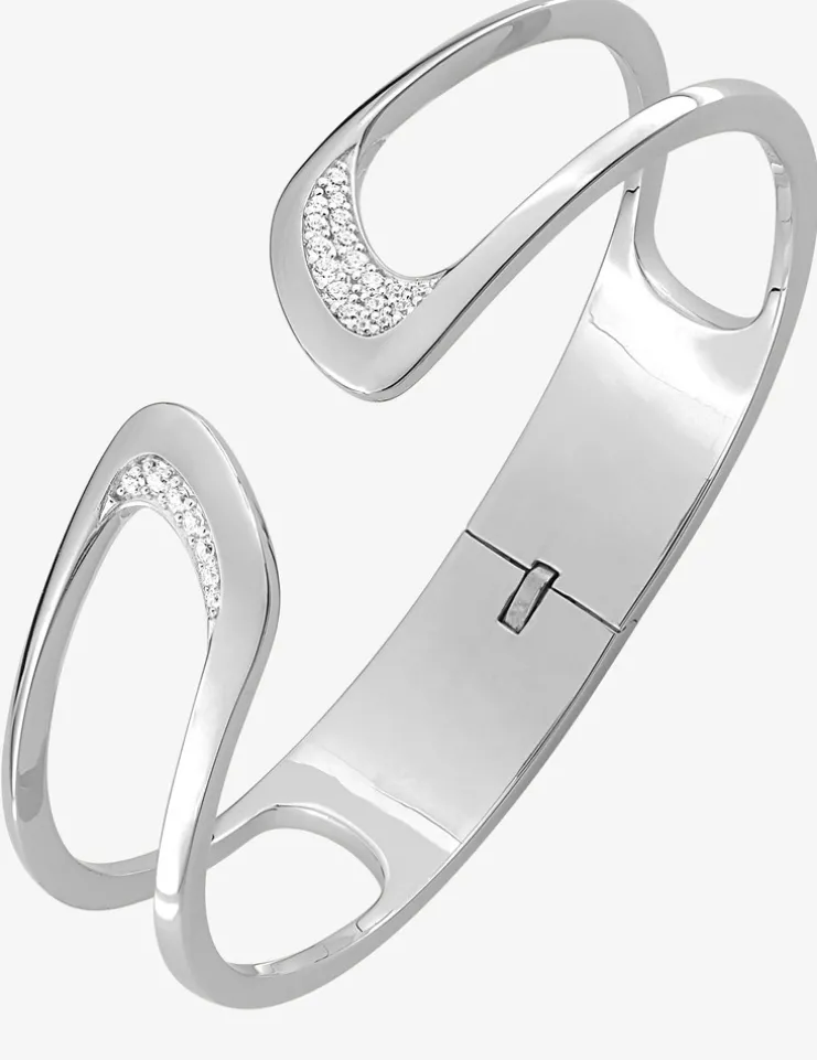 Bracelet type jonc en argent gris 925‰, au design rigide en demi-cercle non fermé. Ce bijou présente des découpes graphiques élégantes, agrémentées de détails en oxyde de zirconium blanc qui ajoutent une touche de brillance. Avec un poids de 30,40 g, ce bracelet est à la fois solide et confortable à porter. Il est équipé d’un fermoir imitation brisure, assurant une fermeture sécurisée tout en conservant un style minimaliste et moderne. Ce bracelet est parfait pour apporter une note de sophistication à votre collection de bijoux.