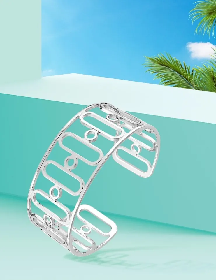 Bracelet jonc ouvert en argent rhodié 925 ‰, composé d’un design ovale et original, offrant une allure contemporaine. Les dimensions de ce bijou sont de 58×48 mm, avec un poids total de 17,70 g, en faisant une pièce imposante qui saura habiller vos tenues les plus simples avec élégance. Parfait pour ajouter une touche de caractère à votre style.