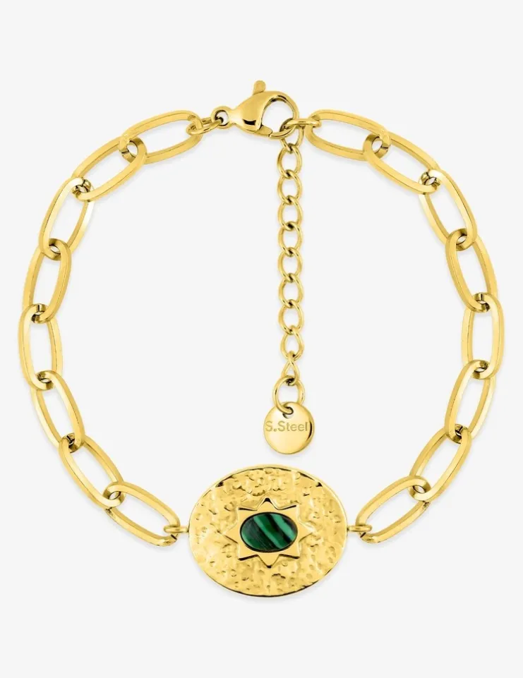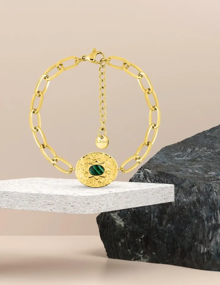 Bracelet maille alternée acier doré et malachite synthétique SO OR
