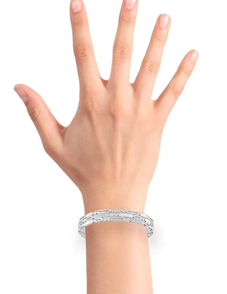 Bracelet aux motifs originaux en argent 925‰ rhodié, orné d’oxydes de zirconium de différentes dimensions. Avec un poids total de 21,10 g, ce bijou unique vous accompagnera au quotidien, ajoutant une touche d’élégance et d’originalité à votre style.