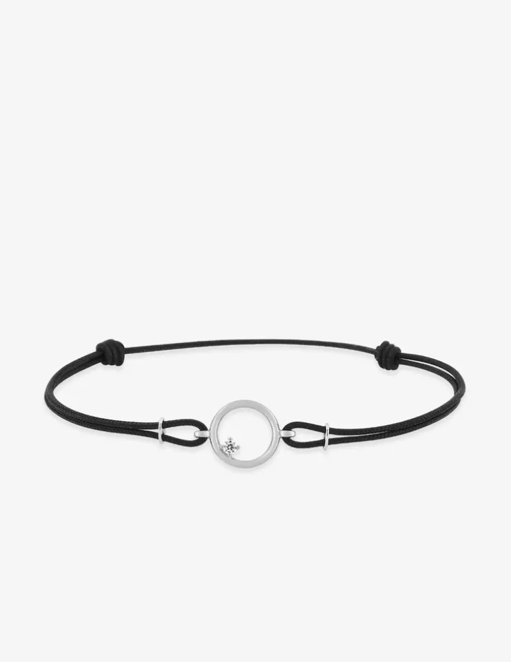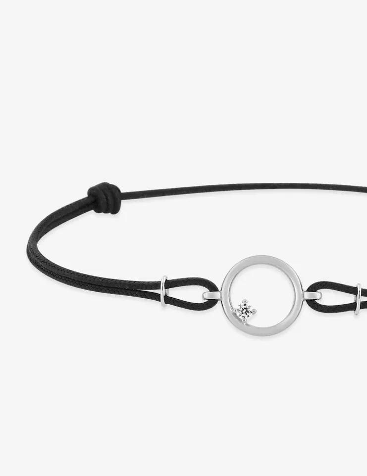 Bracelet en or blanc 750 ‰ (18 carats) oxyde de zirconium et cordon. Il se compose d’un cordon noir réglable par nœuds coulissants avec au centre un motif cercle or blanc ajouré qui contient un oxyde de zirconium serti griffes. Le poids théorique d’or est de 0,40 g. Tendance et moderne à adopter au quotidien.