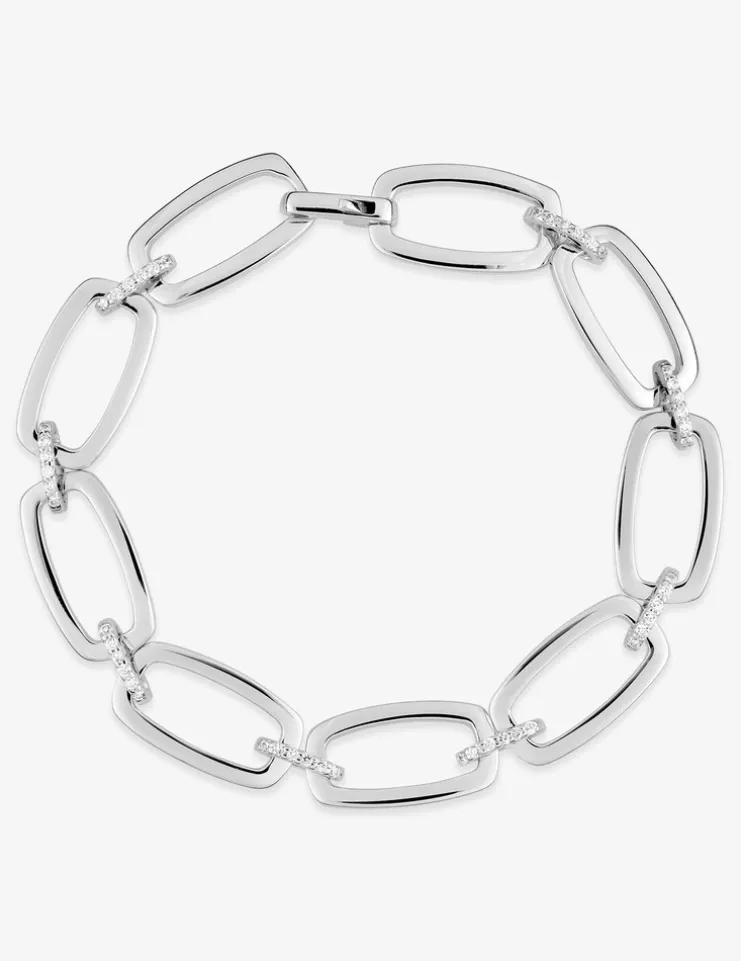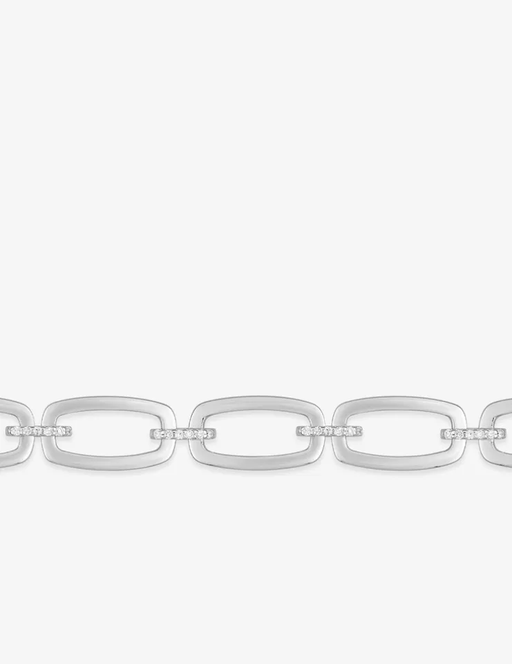 Cet élégant bracelet en argent 925‰ rhodié se compose de motifs rectangles de 20 mm par 10 mm reliés entre eux par des brins sertis d’oxydes de zirconium. Il mesure 18 cm de longueur.