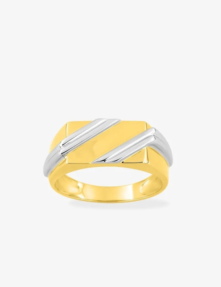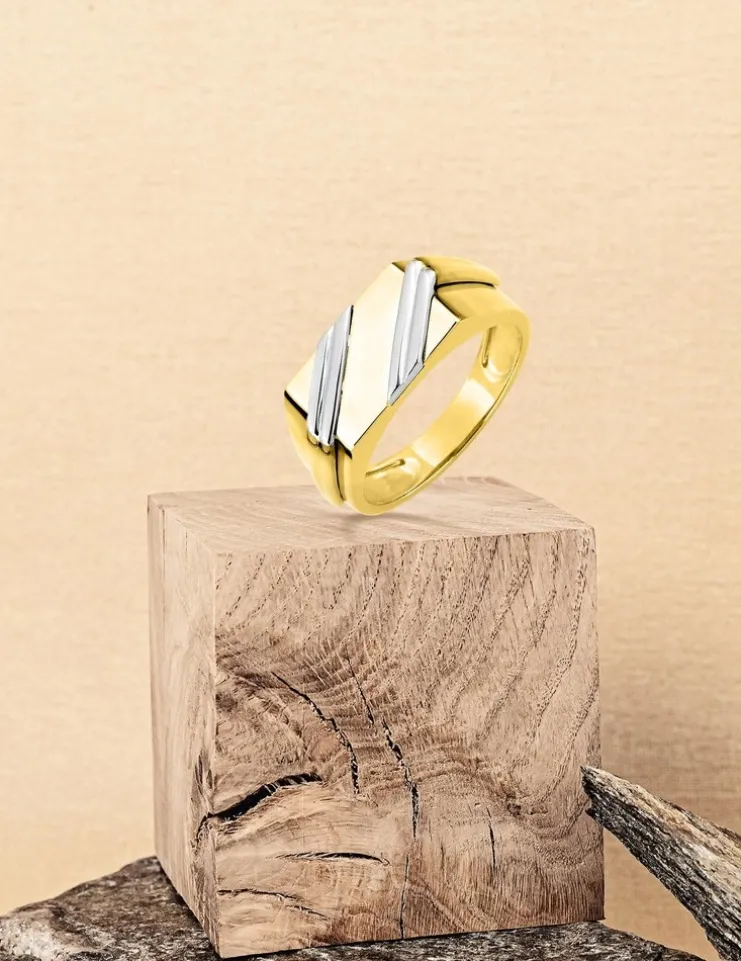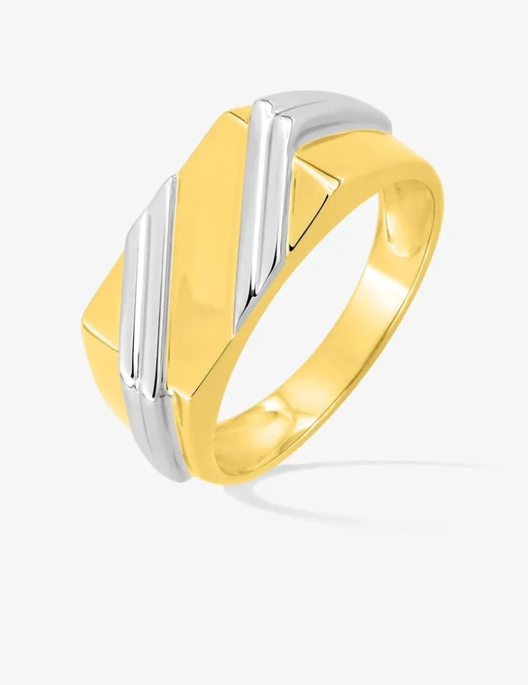 Chevalière bicolore or 750 ‰ (18 carats). Cette chevalière possède un plateau rectangle d’une largeur de 8×16 mm, avec en diagonale, 2 bandes en or blanc légèrements incurvées.