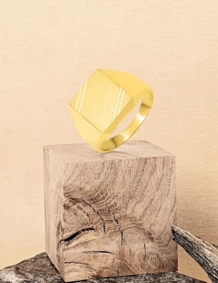Chevalière or jaune 375 ‰ (9 carats). On aime l’esprit géometrique de cette chevalière qui possède un plateau carré, brossé et rainuré aux dimensions 11×11 mm. Le poids théorique d’or est de 5,65 g. Plutôt massif, ce modèle est à porter sans modération.