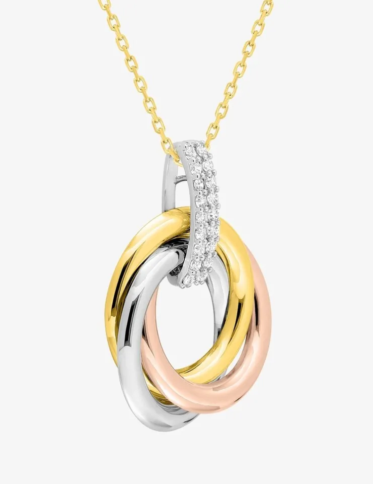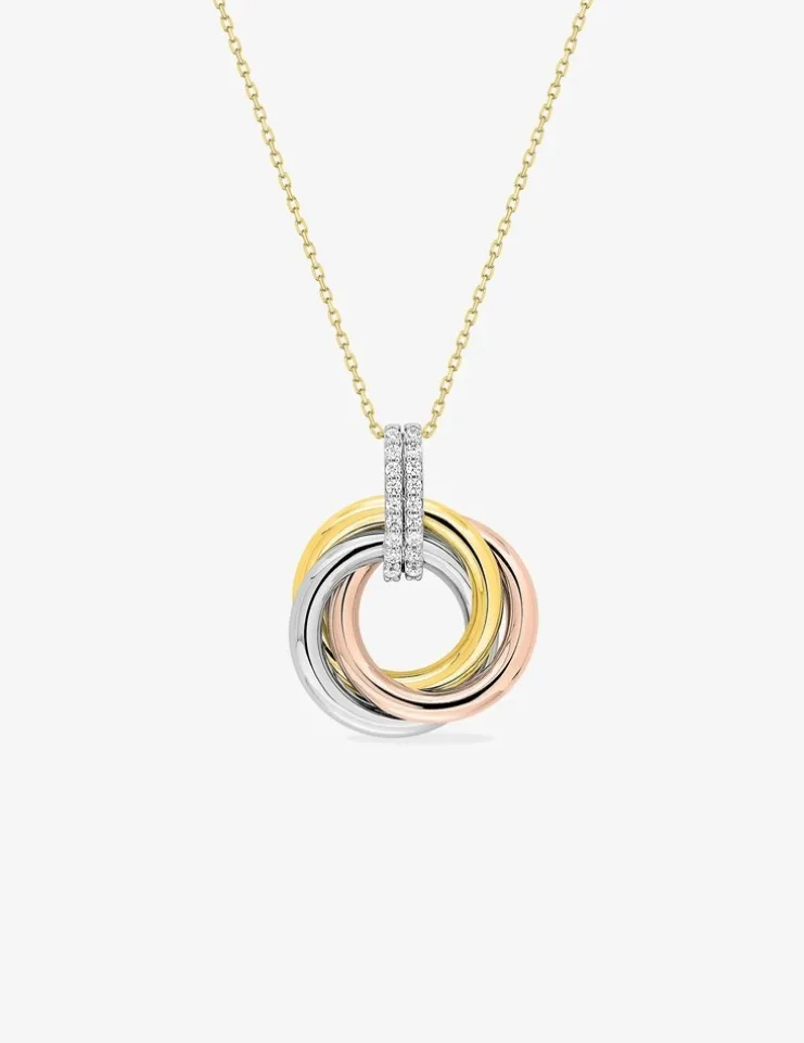 Collier en or jaune et rose 375 ‰ (9 carats) qui se compose de trois anneaux qui s’entrelacent entre l’or jaune, l’or rose et celui recouvert de rhodium. Ils sont reliés à la chaîne par deux barrettes finition rhodium et serties d’oxydes de zirconium. La chaîne de type forçat ronde mesure 42 cm avec un anneau intermédiaire à 40 cm, son poids en or moyen est de 1,40 g.