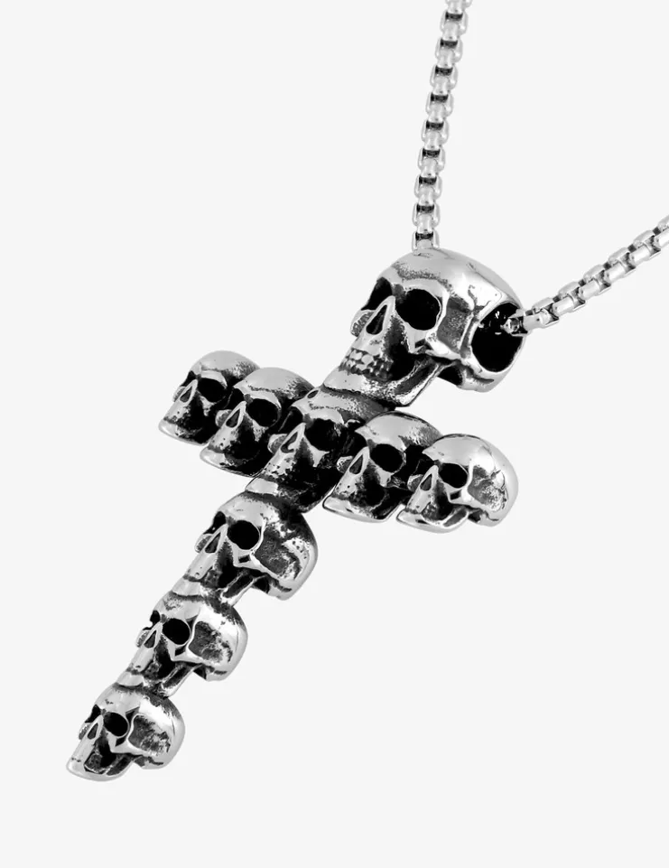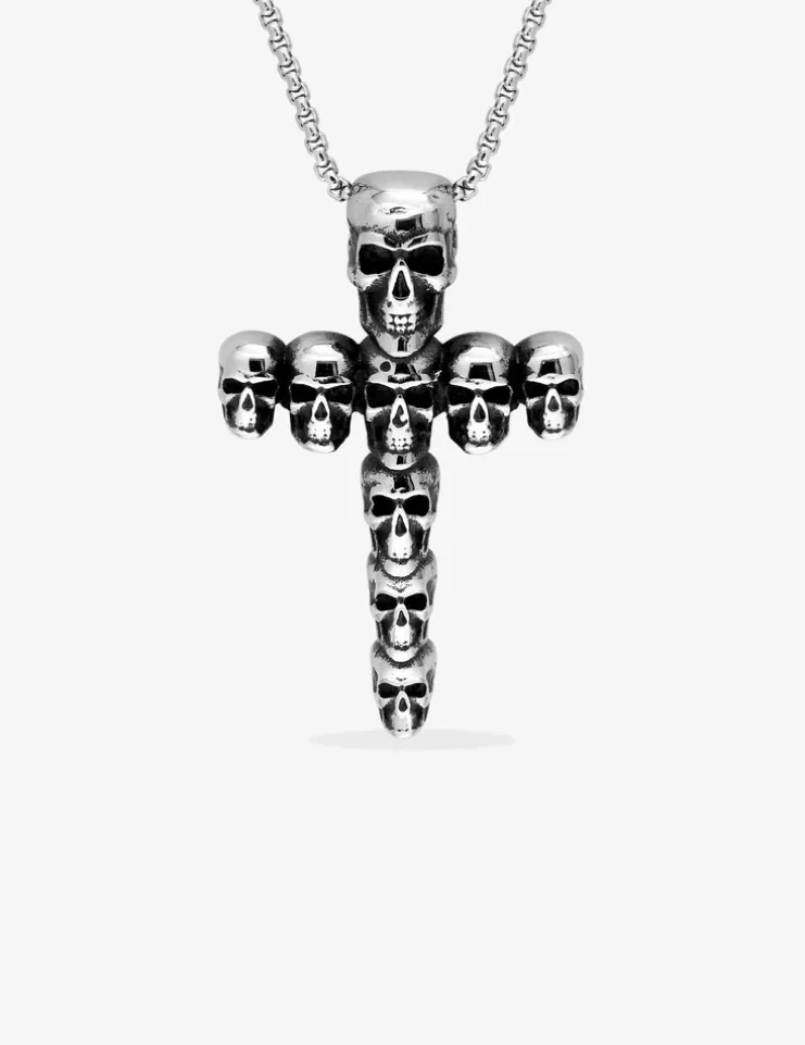 Collier en acier avec têtes de mort en croix et maille fantaisie. Ce bijou audacieux saura compléter vos tenues. Il possède une chaine de 55 cm ornée d’un pendentif de 48 mm de long.composé de têtes de mort. Son poids de 24,40 g.fait de ce collier un bijou alliant robustesse et originalité.
