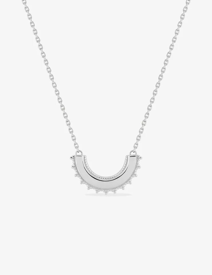 Collier argent 925 ‰ rhodié, il possède une chaîne forçat et un motif demi-cercle poli à l’intérieur et fantaisie sur les bordures, le collier mesure 42 cm et se ferme par un anneau ressort.