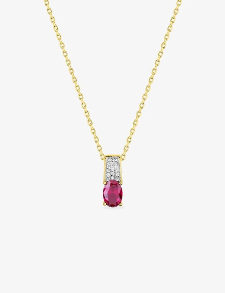Cette chaîne forçat en plaqué or possède un pavage d’oxydes de zirconium blancs suivi d’un oxyde de zirconium rouge ovale de 7 mm de hauteur pour 5 mm de largeur. Le collier mesure 40 cm avec 3 cm de chaîne de rappel en plus et possède un fermoir en anneau ressort. Une élégante touche de couleur.